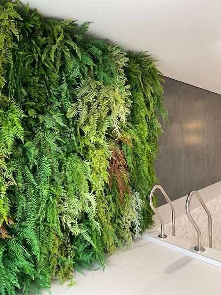 Пышная вертикальная композиция из искусственных папоротников и декоративных растений создаёт яркий акцент в лаконичном пространстве бассейна.
