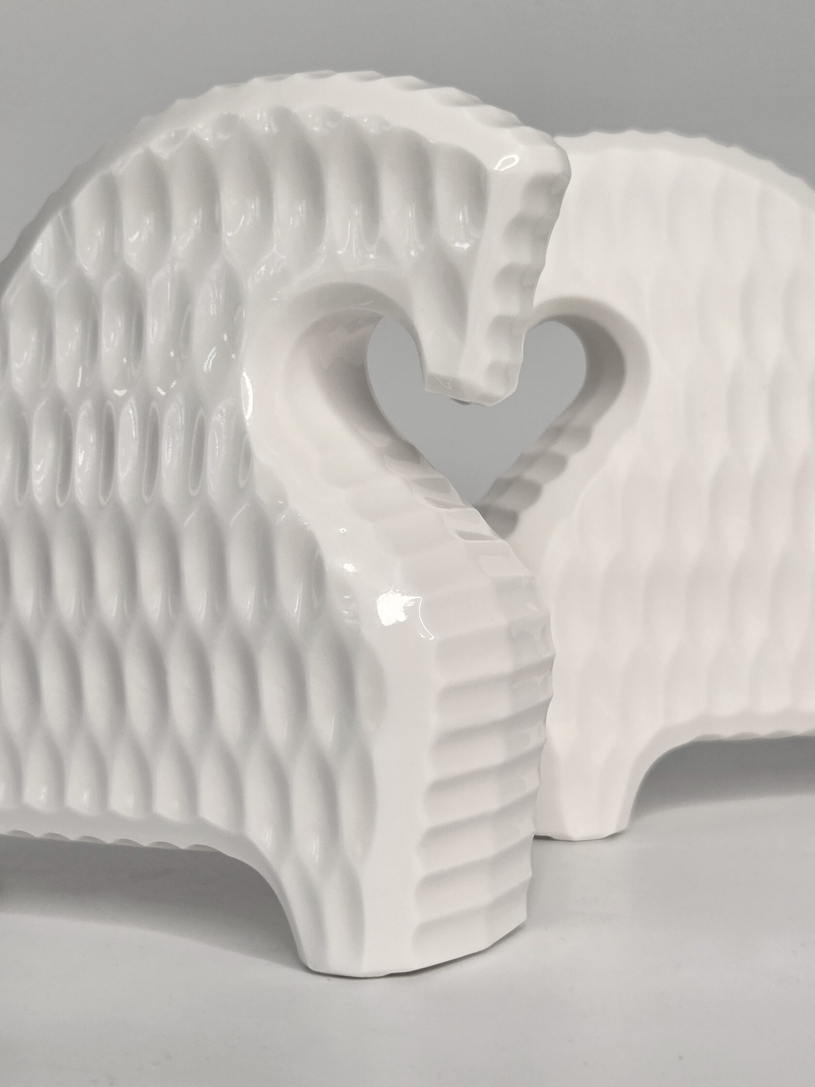 Настольный декор в виде фарфорового коней, стилизованных под ручную резьбу по дереву. Необычное сочетание материала и фактуры делает "Коников" уникальным предметом интерьера, современным, но с этническим контекстом.