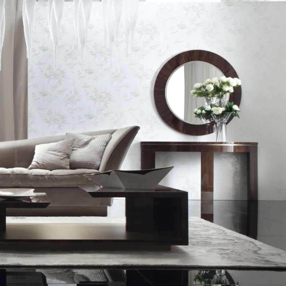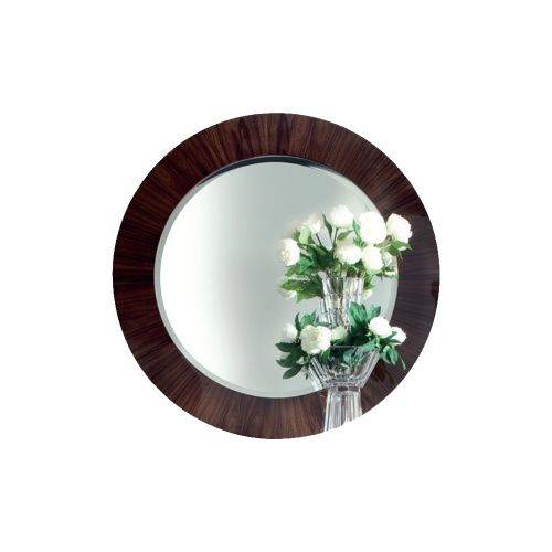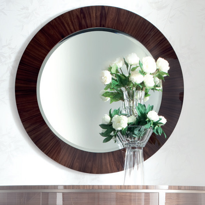 Круглое зеркало в раме, облицованной шпоном из бразильского палисандра с глянцевым полиэфирным покрытием.