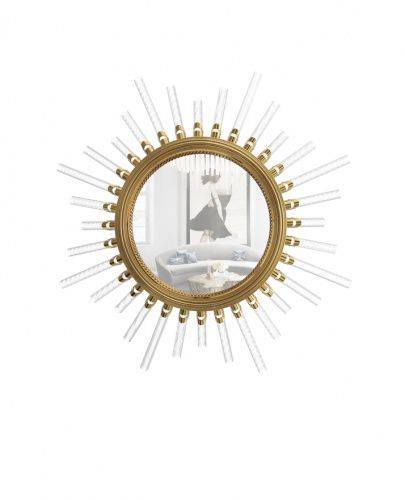Круглое зеркало в раме из латуни золотого цвета и рифленых стеклянных цилиндров.
