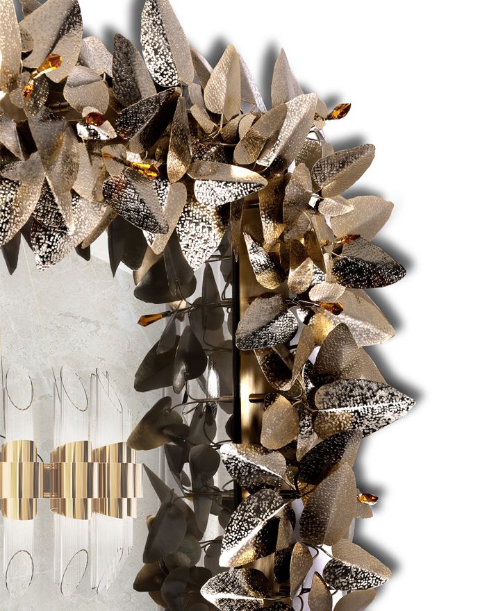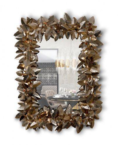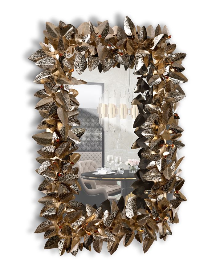 Прямоугольное зеркало в раме, «сотканной» из листьев из кованой латуни с позолоченной отделкой и кристаллами Swarovski.