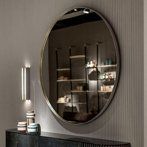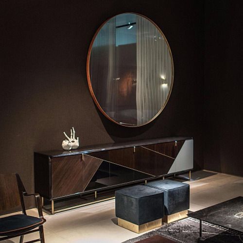 Зеркало со структурой из фанеры тополя, окрашенного в черный цвет. Рама из сатинированной латуни или натуральной кожи в цветах из каталога Baxter.