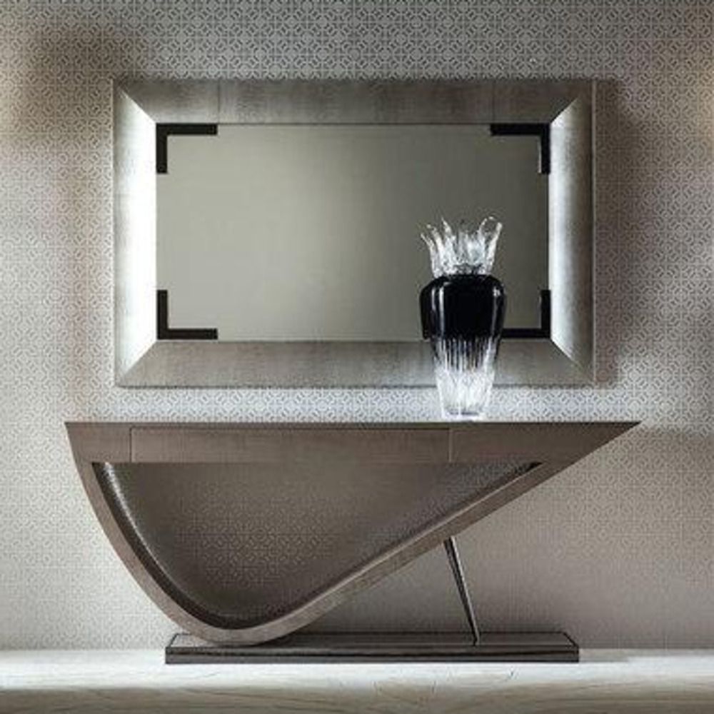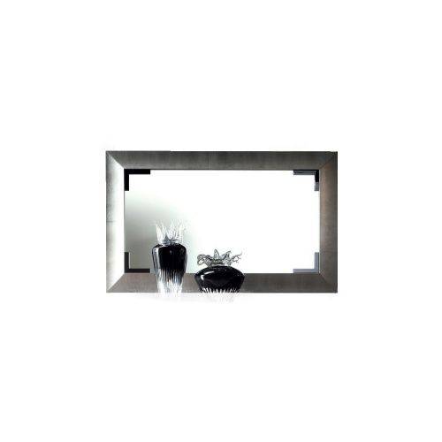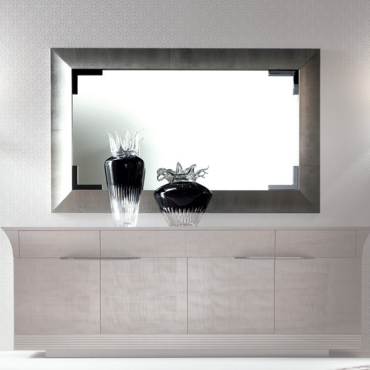 Зеркало в раме, обитой натуральной кожей серебристого цвета с принтом «под игуану». Декоративные элементы изготовлены из нержавеющей стали насыщенного тёмно-серого цвета.