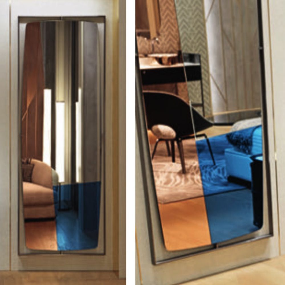 Зеркало с тремя хроматическими секциями: прозрачное, розовое и синее зеркала. Рама из сатинированной нержавеющей стали прикреплена к зеркалу четырьмя латунными элементами. Задняя часть выполнена из дерева черного цвета. Дизайн: Роберто Лаццерони (Roberto Lazzeroni).