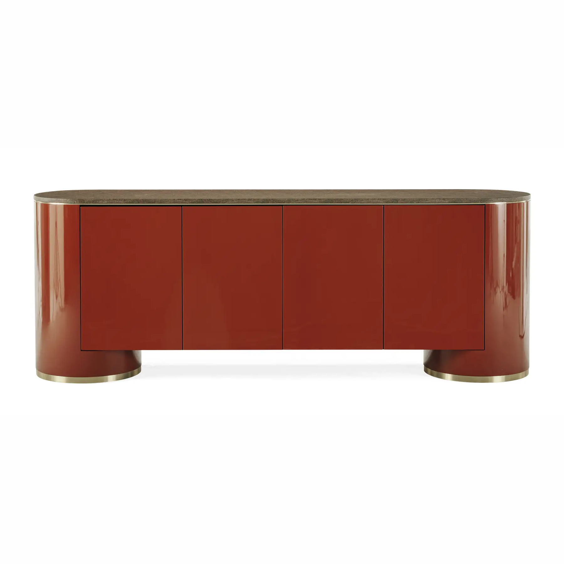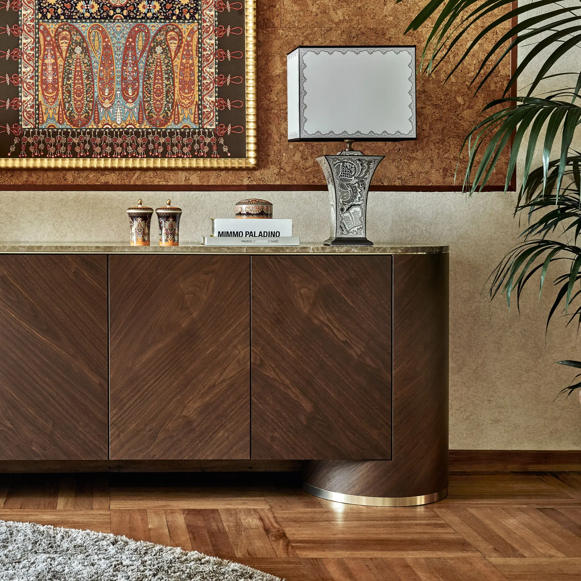 Корпус, выполненный из гнутой многослойной древесины тополя, обрамлён естественными текстурами и оттенками, которые подчёркивают природную глубину материалов. Поверхность может быть выполнена в глянцевом лаке или в фирменных шпонах коллекции — шпон персидского ореха Persian Walnut или шпон тёмного ореха каналетто Dark Dyed Canaletto Walnut — с диагональным направлением волокон под углом 45°, что придаёт буфету динамику и благородное изящество.