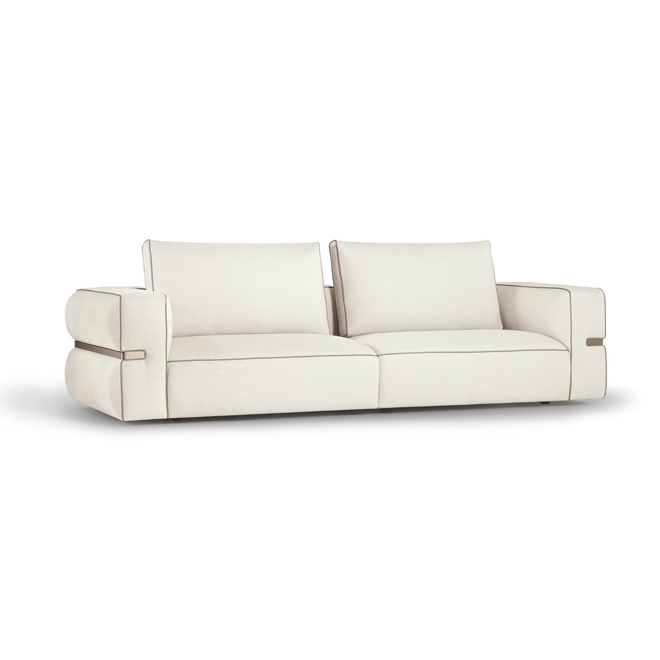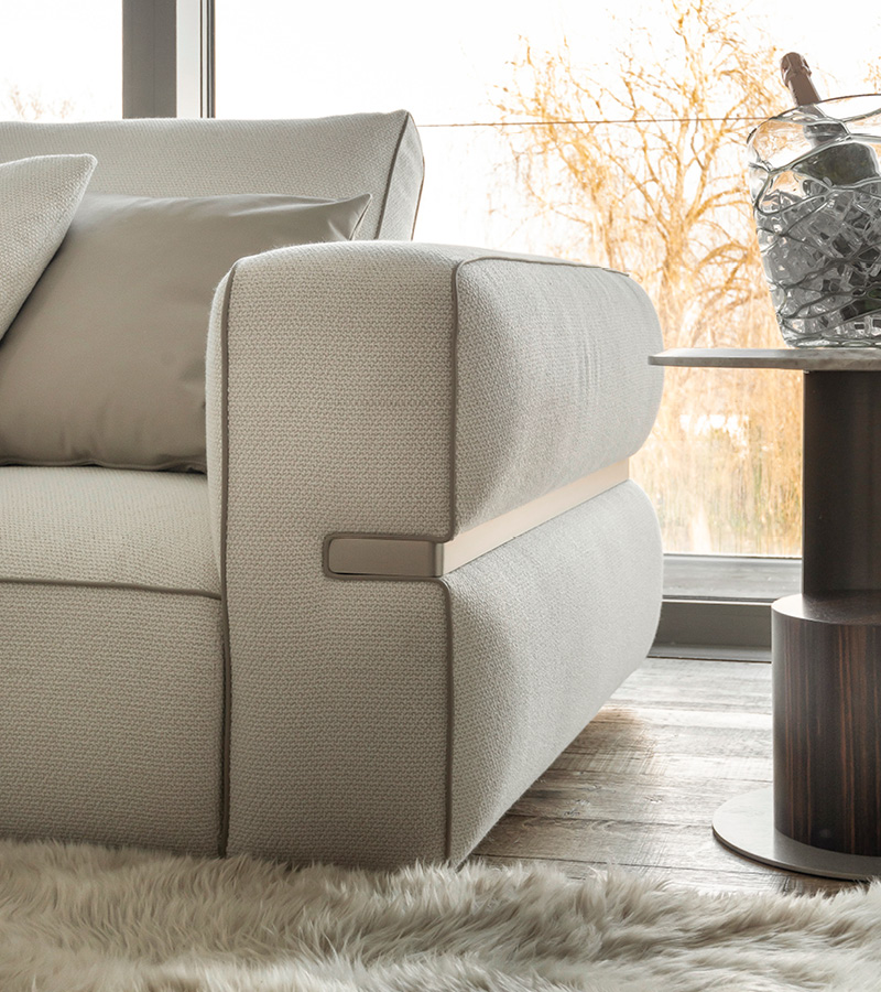 Вставки на спинке и боковых частях выполнены из нержавеющей стали с сатинированной гальванической титановой отделкой, которая не только добавляет блеска и глубины визуальному облику дивана, но и подчёркивает его индустриальный шик, свойственный современному дизайну.