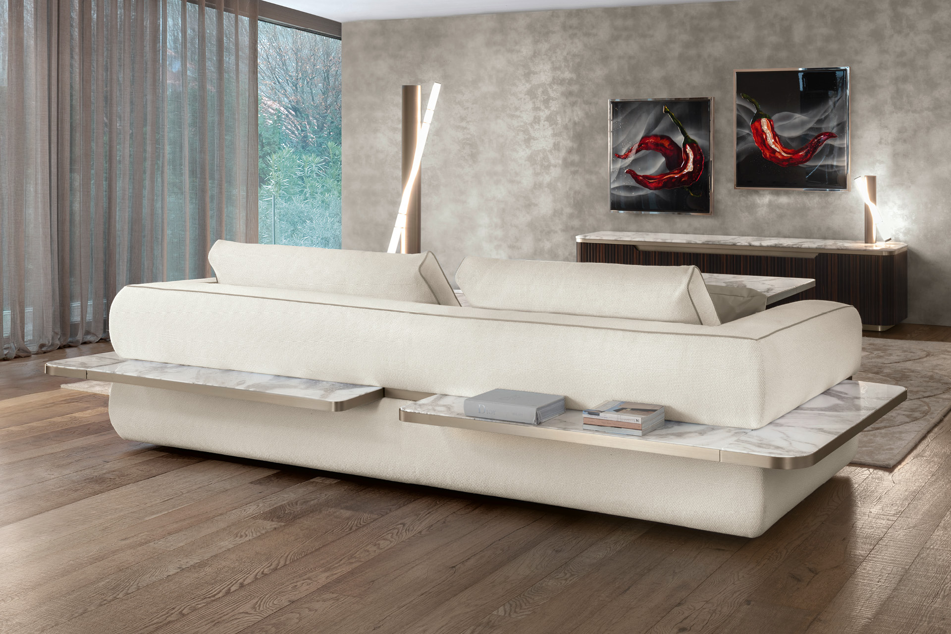 Дизайнерский диван Luxor от итальянского бренда Giorgio Collection с интегрированными мраморными полками — это не просто предмет интерьера, а настоящий архитектурный объект, который объединяет скульптурную эстетику, премиальные материалы и исключительный уровень удобства. Идеален для взыскательных интерьеров, где ценится как визуальное совершенство, так и функциональность.