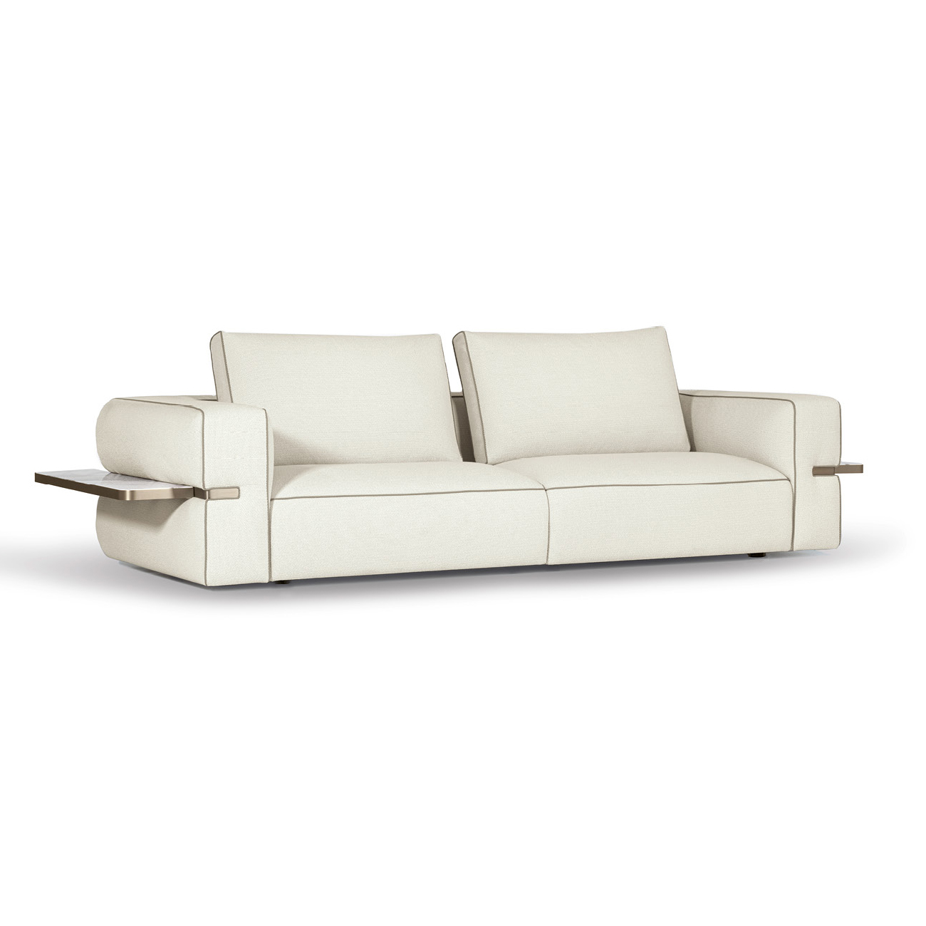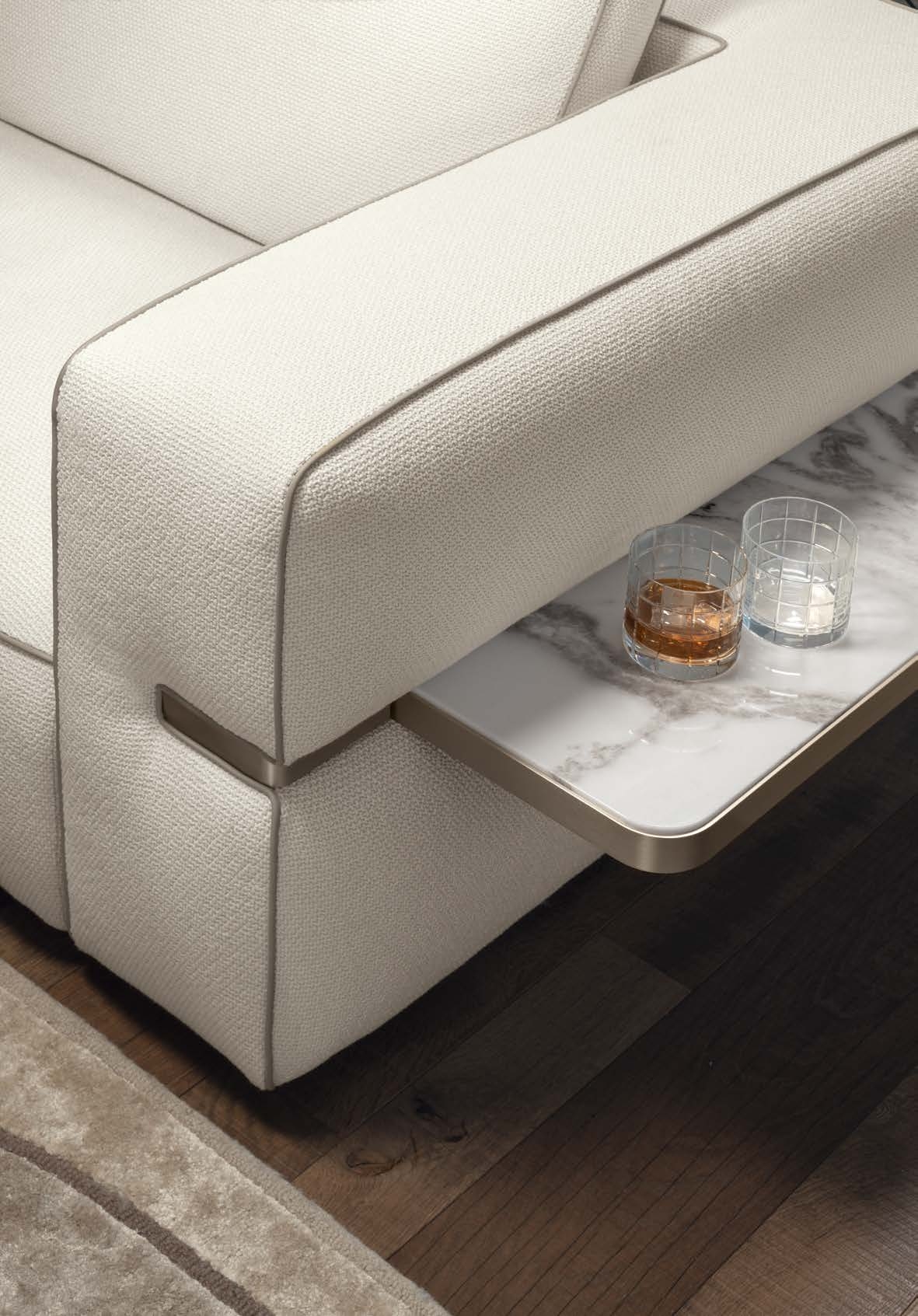 Две вставки из натурального мрамора, элегантно интегрированные в спинку и боковые панели дивана, становятся не только декоративным акцентом, но и функциональным элементом. Они идеально подходят для размещения книг, декоративных аксессуаров или бокала вина.