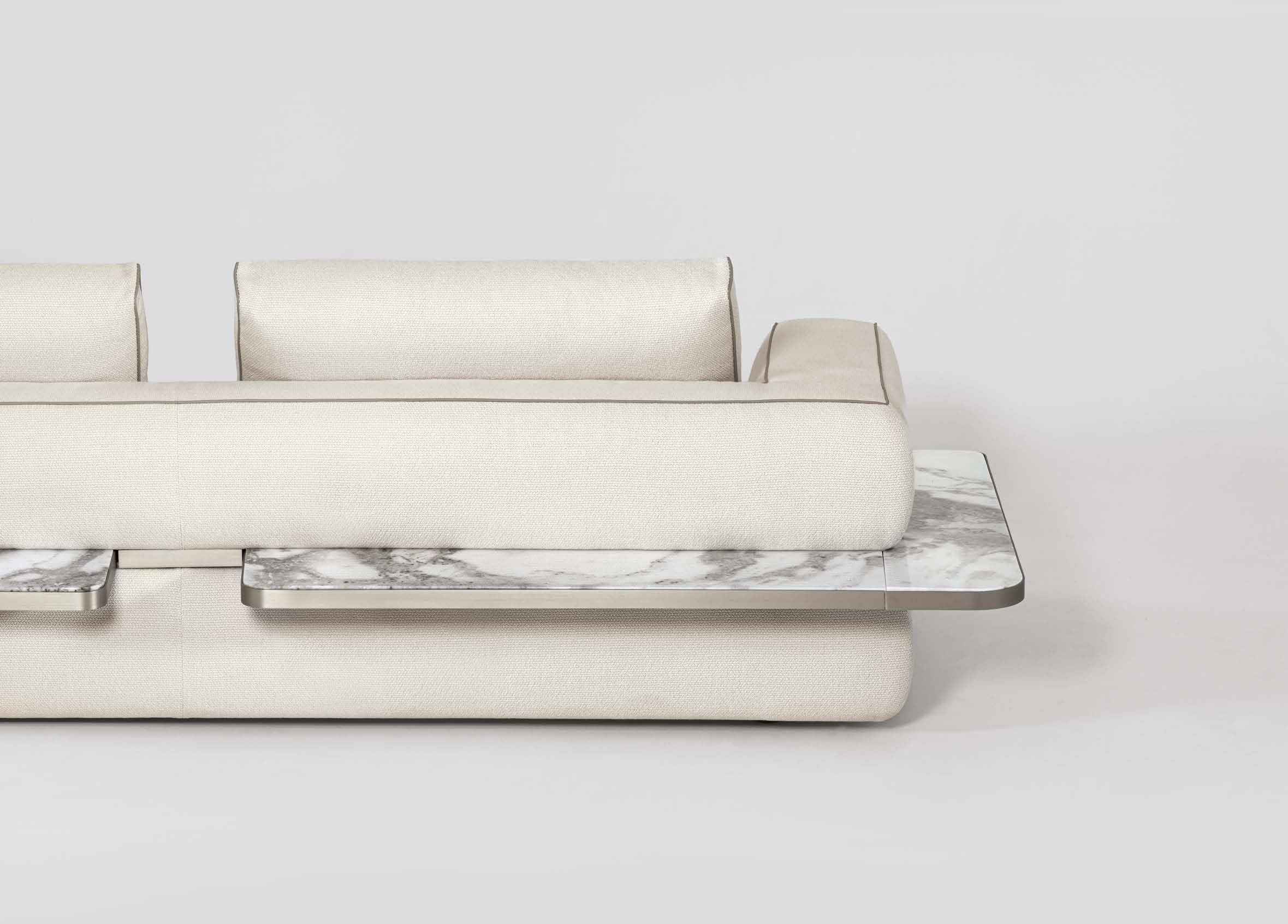 Мраморные полки расширяют сценарии использования, превращая диван в функциональный остров в интерьере.
