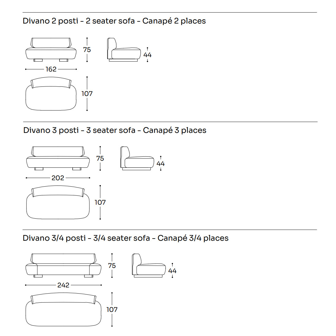 Размеры: W162xD107xH75 см, W202xD107xH75 см, W242xD107xH75 см.