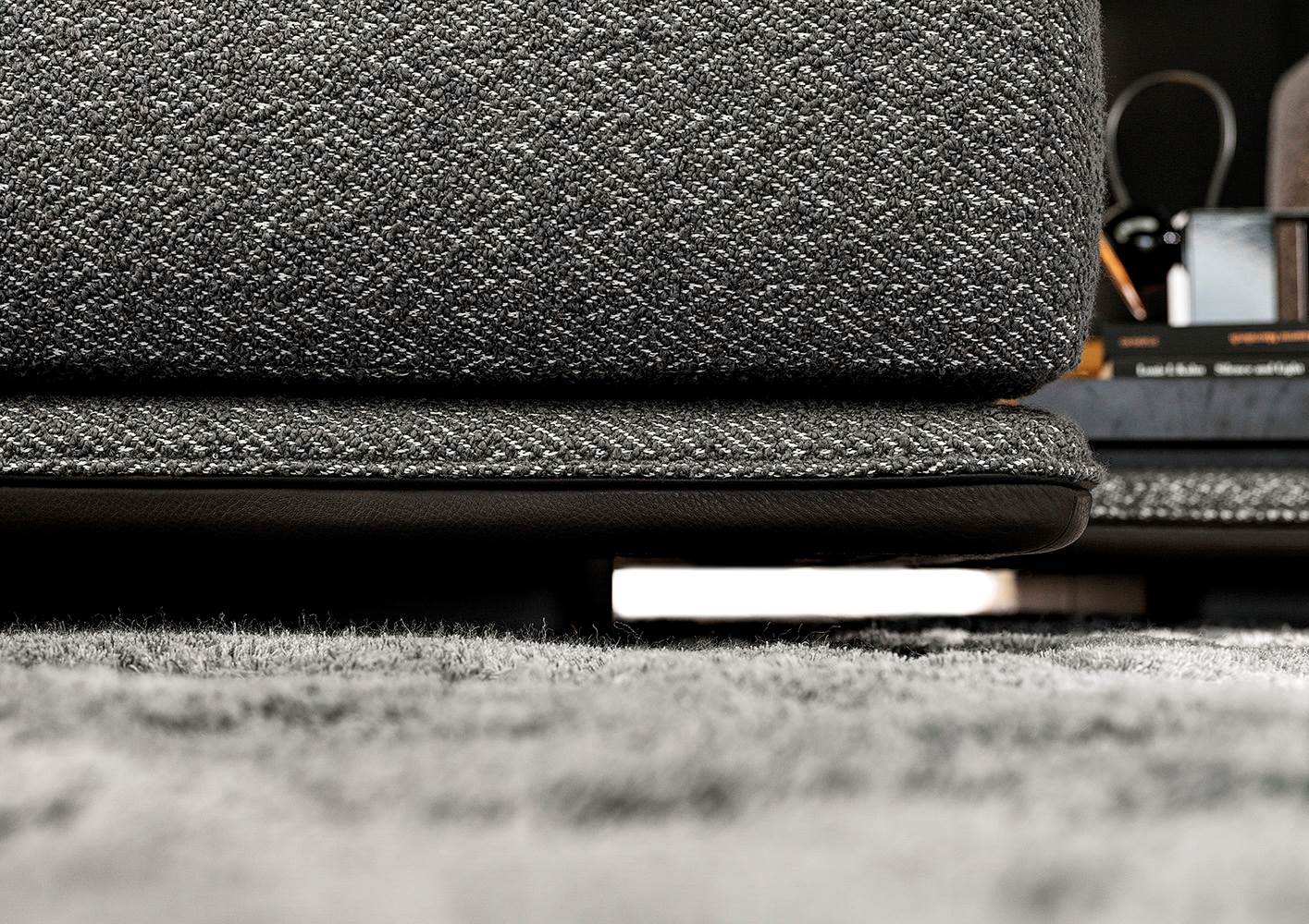Основание, на которое опираются мягкие кресла, изготовлено из продуманного сочетания материалов: полностью из кожи или ткани или из оригинального сочетания того и другого, что придает им еще более изысканный и престижный вид. В варианте из ткани две полоски соединяются молнией, скрытой за загнутым швом, что представляет собой эстетичный мотив, позволяющий практично и быстро снять покрытие. С другой стороны, у основания, полностью обтянутого кожей, накладка выполнена внахлест: изысканная технология производства, вдохновленная миром высокой моды, заключается в том, что полоски кожи сшиваются друг с другом путем загибания краев.