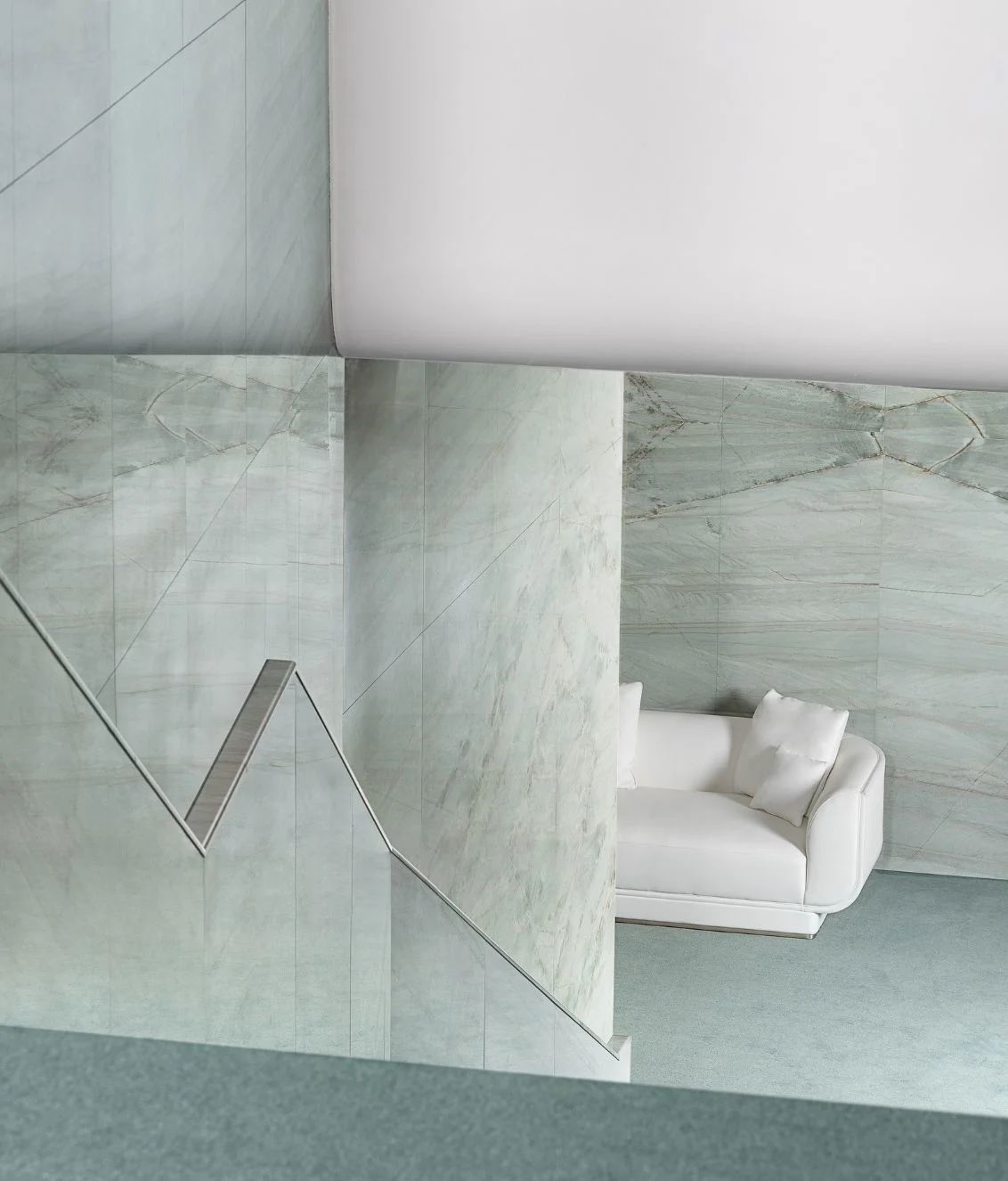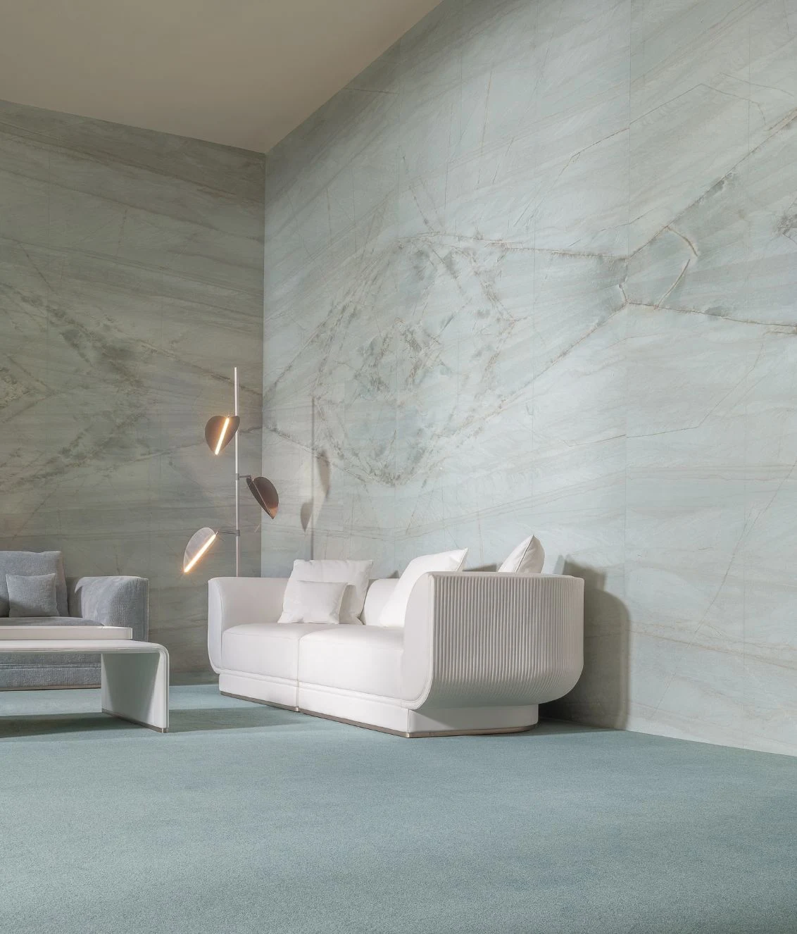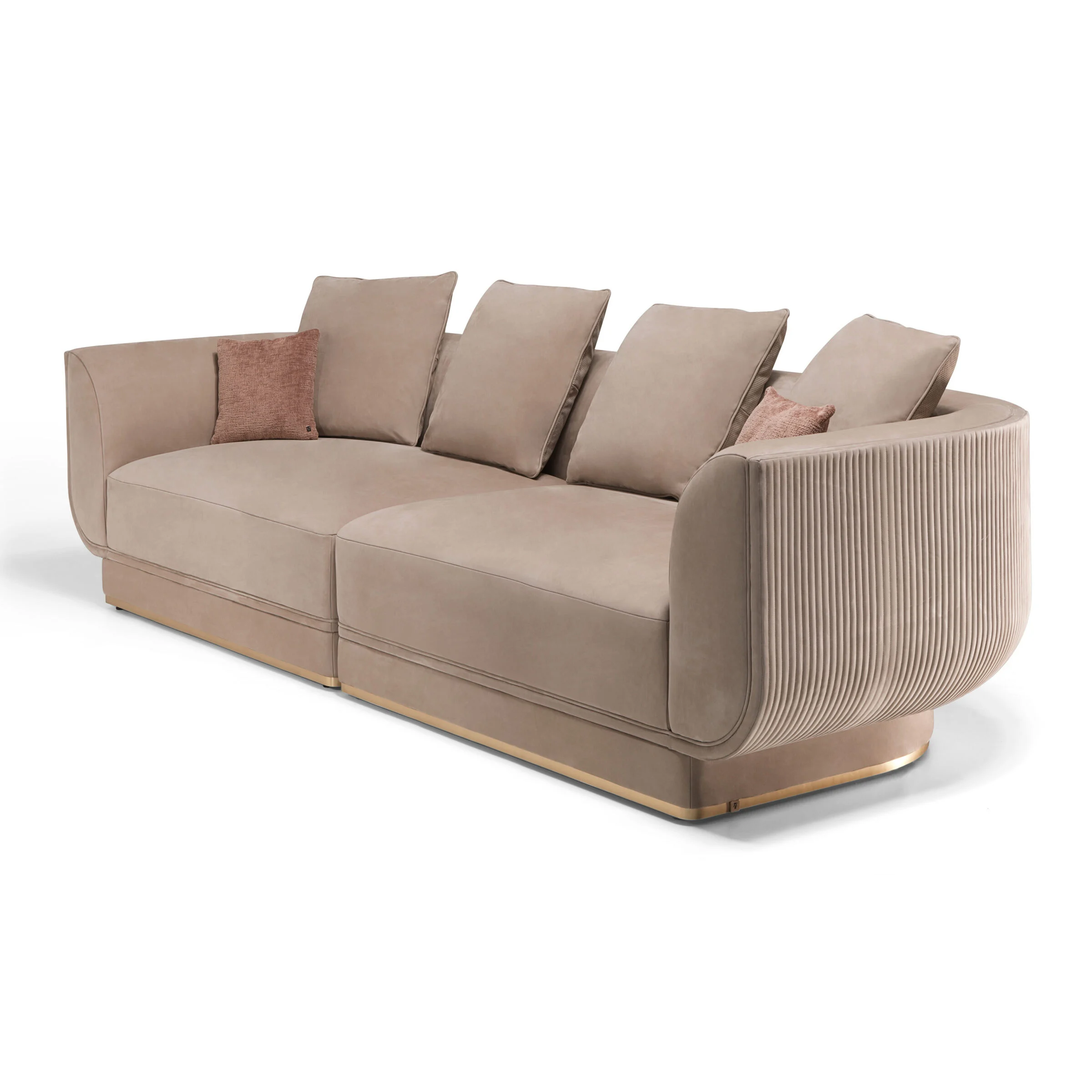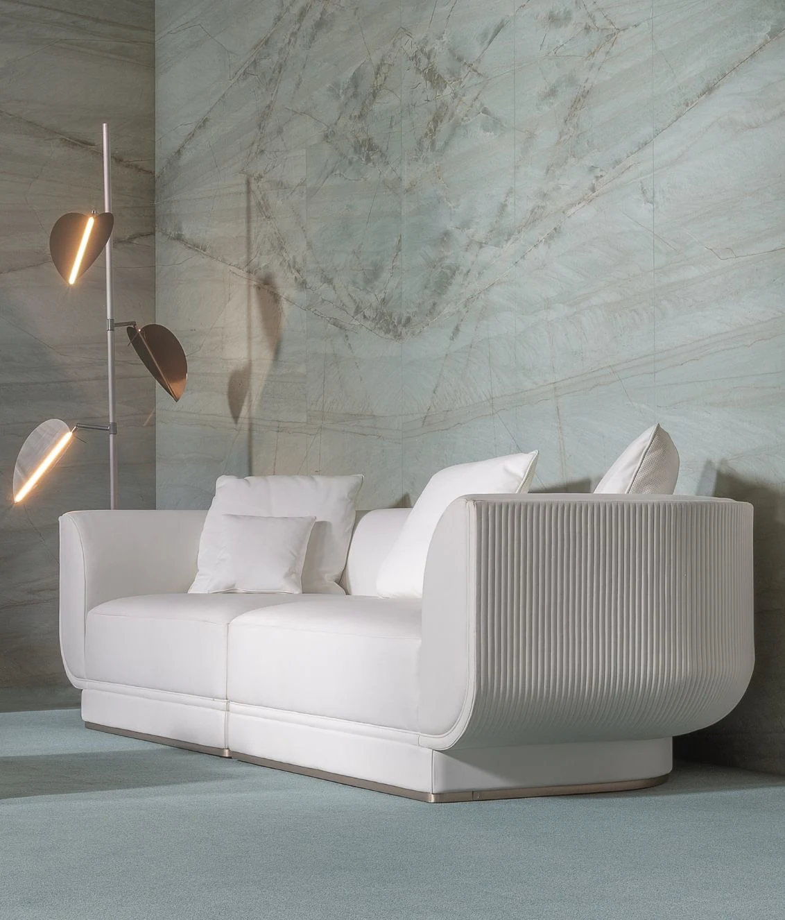 Архитектурный ритм задаёт вертикальная каннелированная стёжка, украшающая внешнюю часть спинки и боковых частей. Этот декоративный приём подчеркивает изысканность силуэта и придаёт дивану характер haute couture.