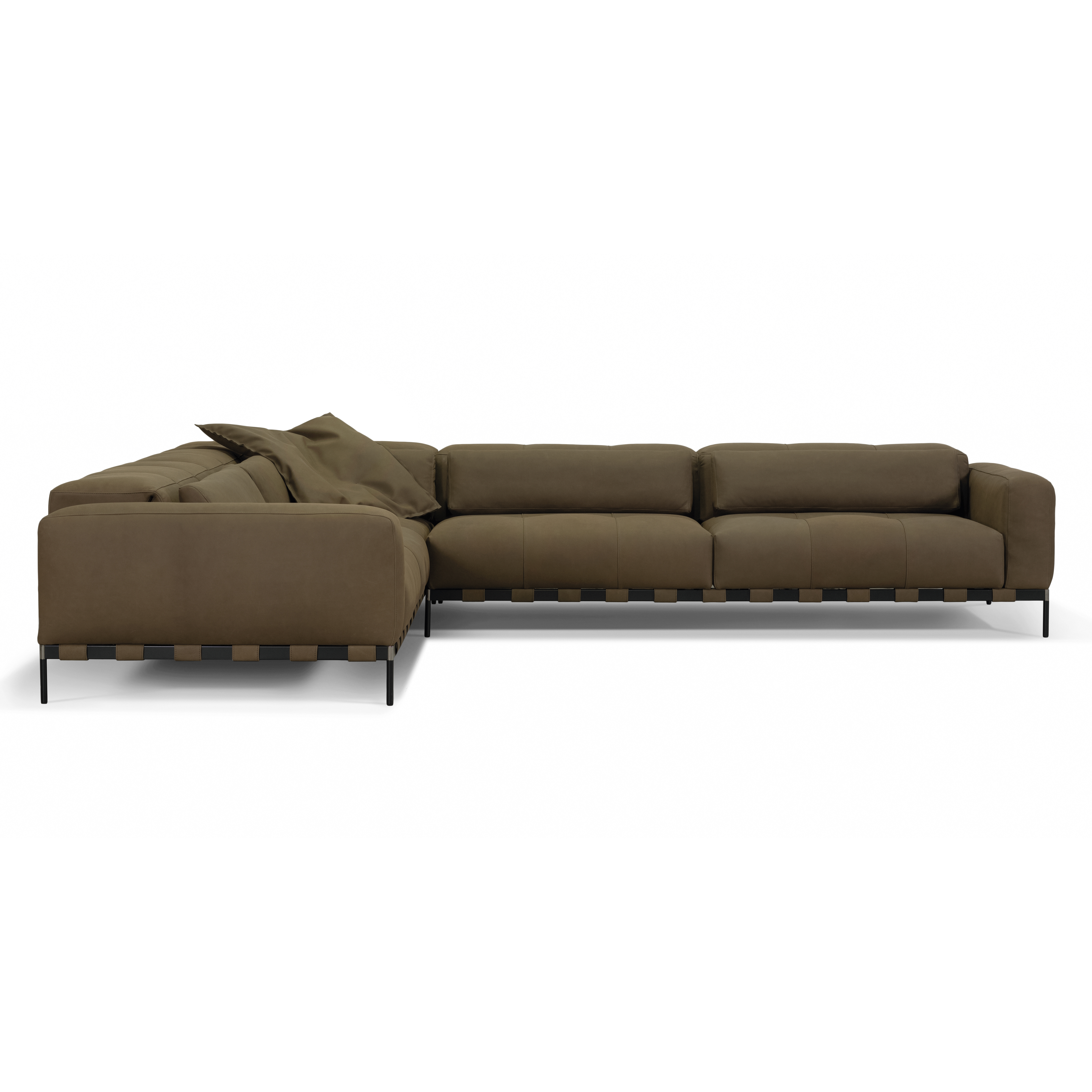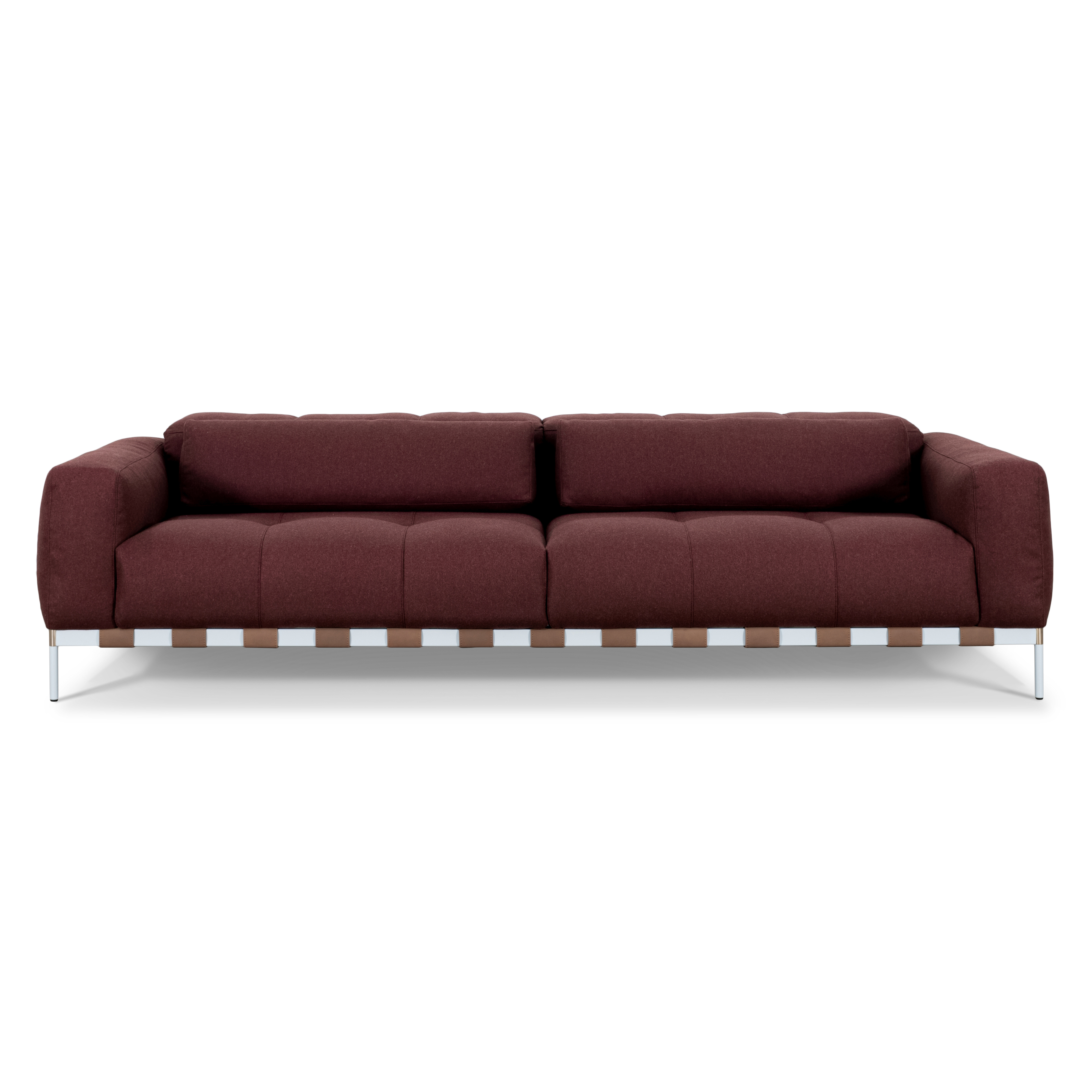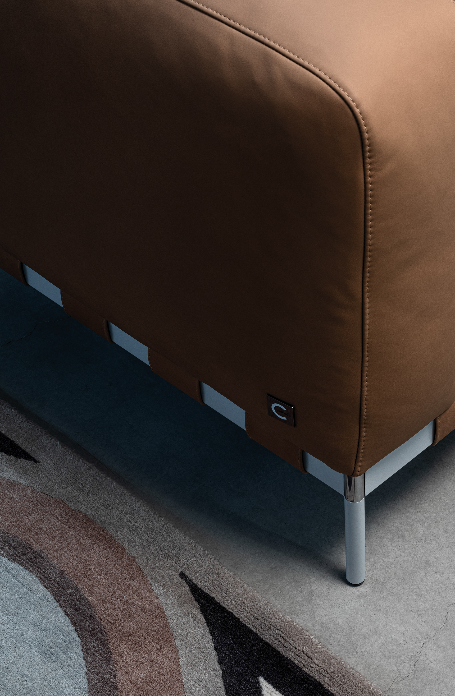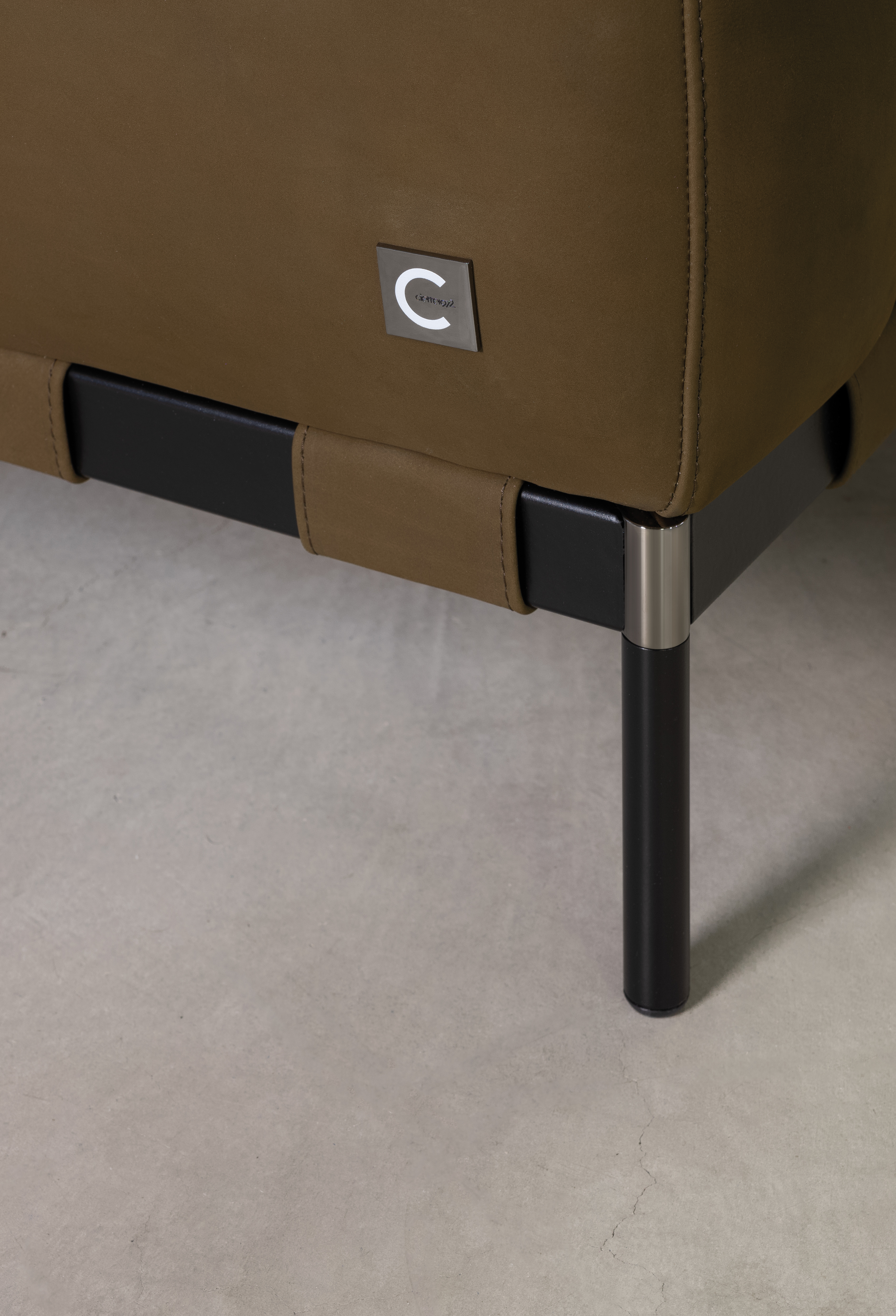Диван установлен на матовое лакированное металлическое основание, которое отличается прочностью и современным характером. Оно доступно в четырёх вариантах: глубокий чёрный (9005), светлый нейтральный (9002), насыщенный тёмный красный (3007) и благородный зелёный (6008). Такой выбор отделок позволяет гармонично интегрировать модель в интерьер различного стиля — от минимализма до эклектики.
