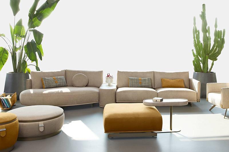Центральный встроенный кофейный столик: расположен между секциями дивана и имеет округлую прямоугольную форму. Столешница доступна в вариантах из стекла, керамики или мрамора, что позволяет подобрать идеальное сочетание с интерьером.​