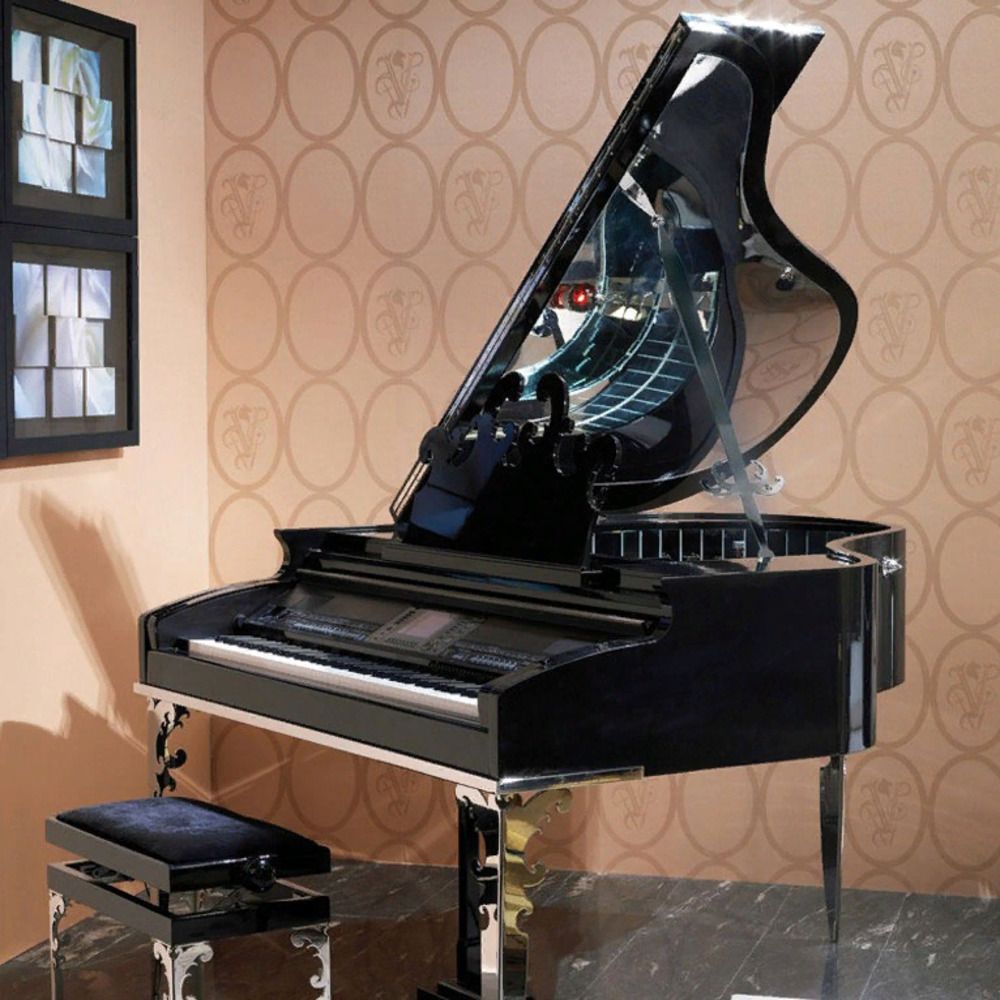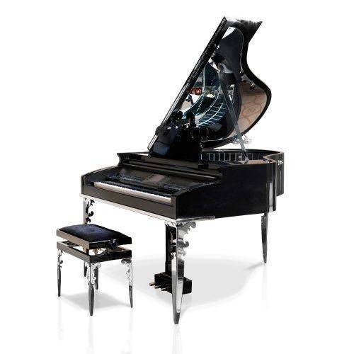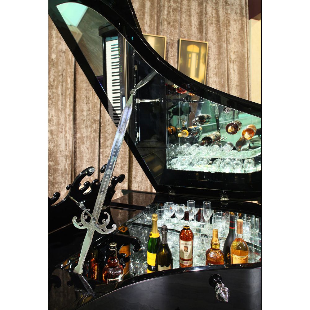 Структура из дерева. Отделка в черном лаке. Декоративные ножки из стали. Барная ниша, под крышкой рояля, в отделке из зеркальной мозаики. Встроен синтезатор Yamaha.