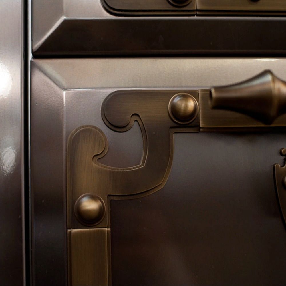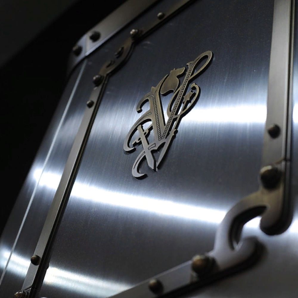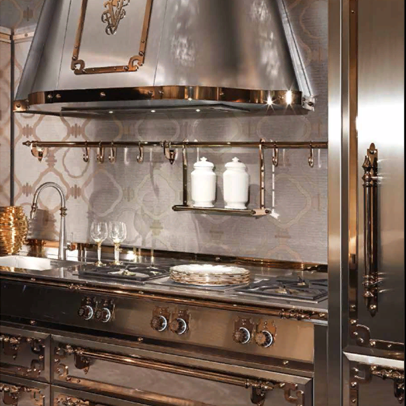 Дизайнеры нашли невероятное решение для кухни Visionnaire Victorian – шкафы, ящики и даже вытяжку они задекорировали полированным металлом. Глянцевые поверхности гарнитура дополнены элегантными вставками из бронзы. Не забыт и легендарный вензель – им украшена массивная вытяжка, нависающая над газовой панелью.