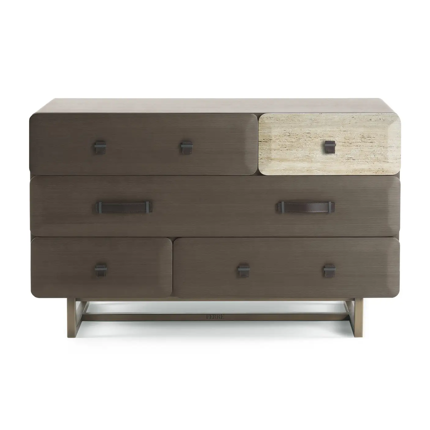 Ручки выполнены из чёрного металла и тёмно-коричневой седельной кожи. Контраст фактур придаёт комоду особую утончённость и отражает характер бренда.