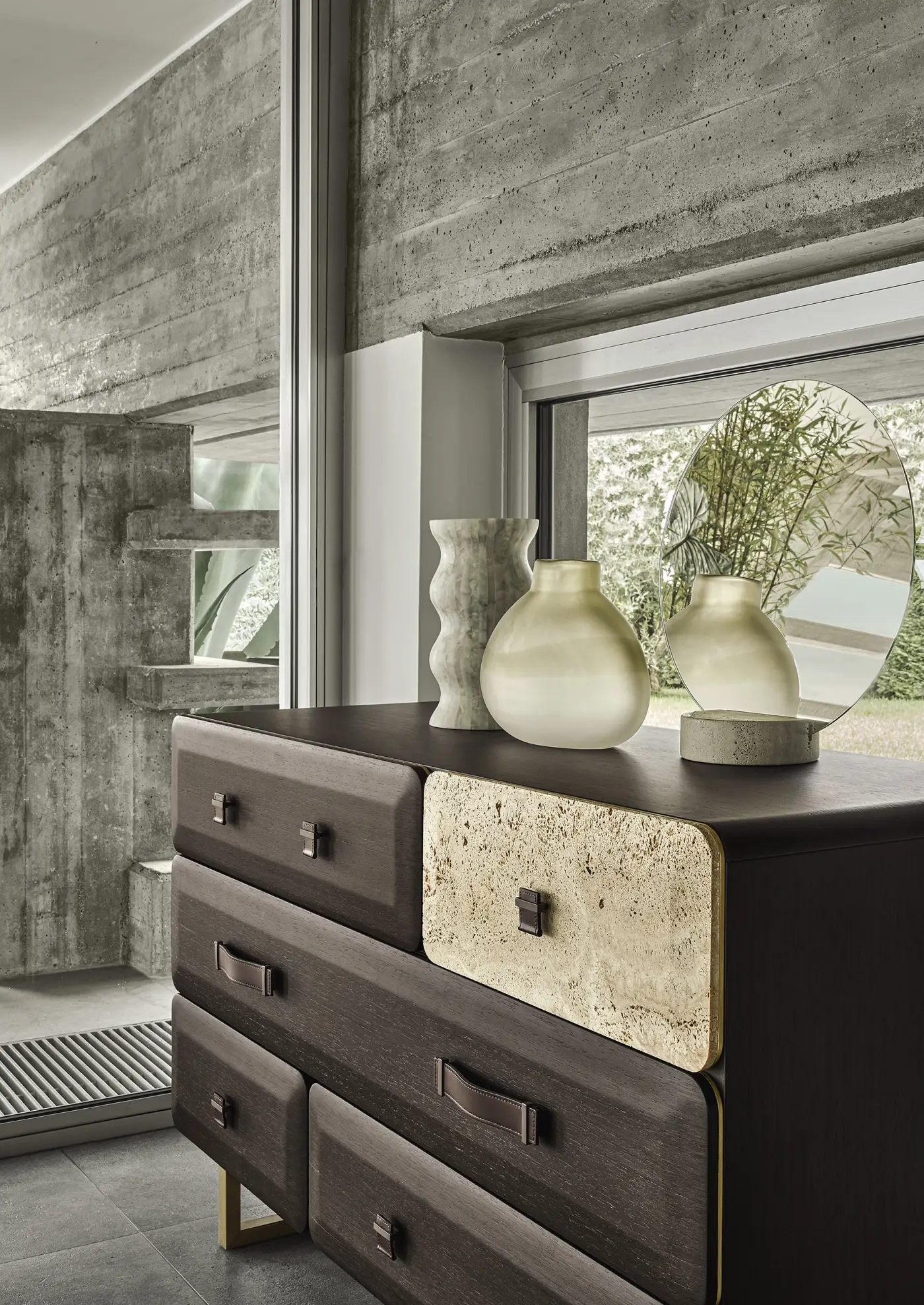 Один из фасадов ящиков может быть выполнен в натуральном мраморе или кварците из коллекции Gianfranco Ferré Home, добавляя комоду эксклюзивности.