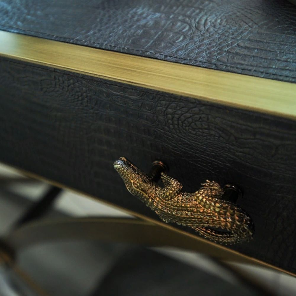 Основание из металла доступно в отделках из коллекции Roberto Cavalli Home. Верх и ящички обиты кожей, экокожей или с отделкой шпоном из коллекции. Ручка и логотип из латуни с платиновой или золотой отделкой.