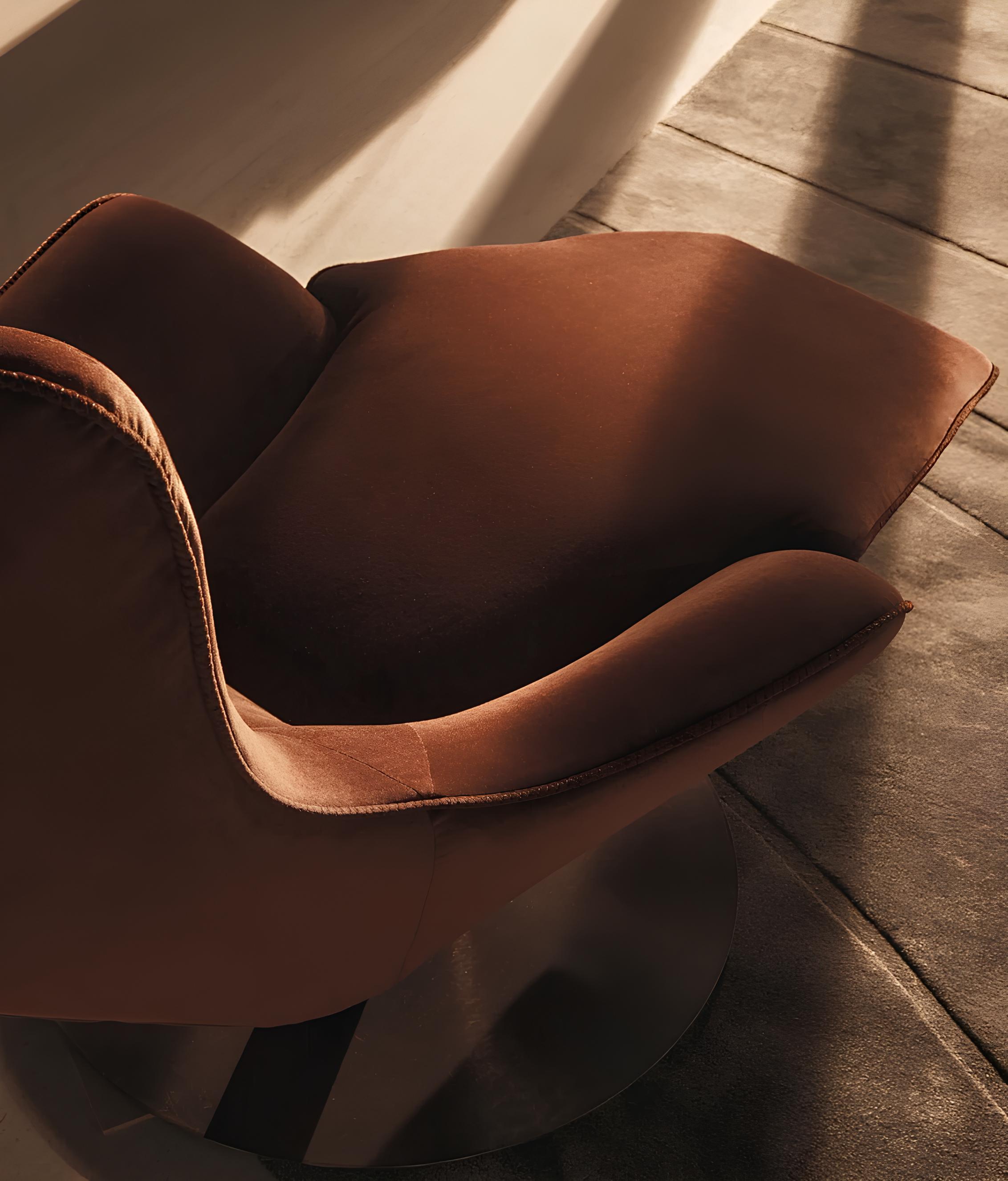 Круглая металлическая платформа придаёт креслу устойчивость и современный акцент, а также визуально уравновешивает масштабность верхней части.