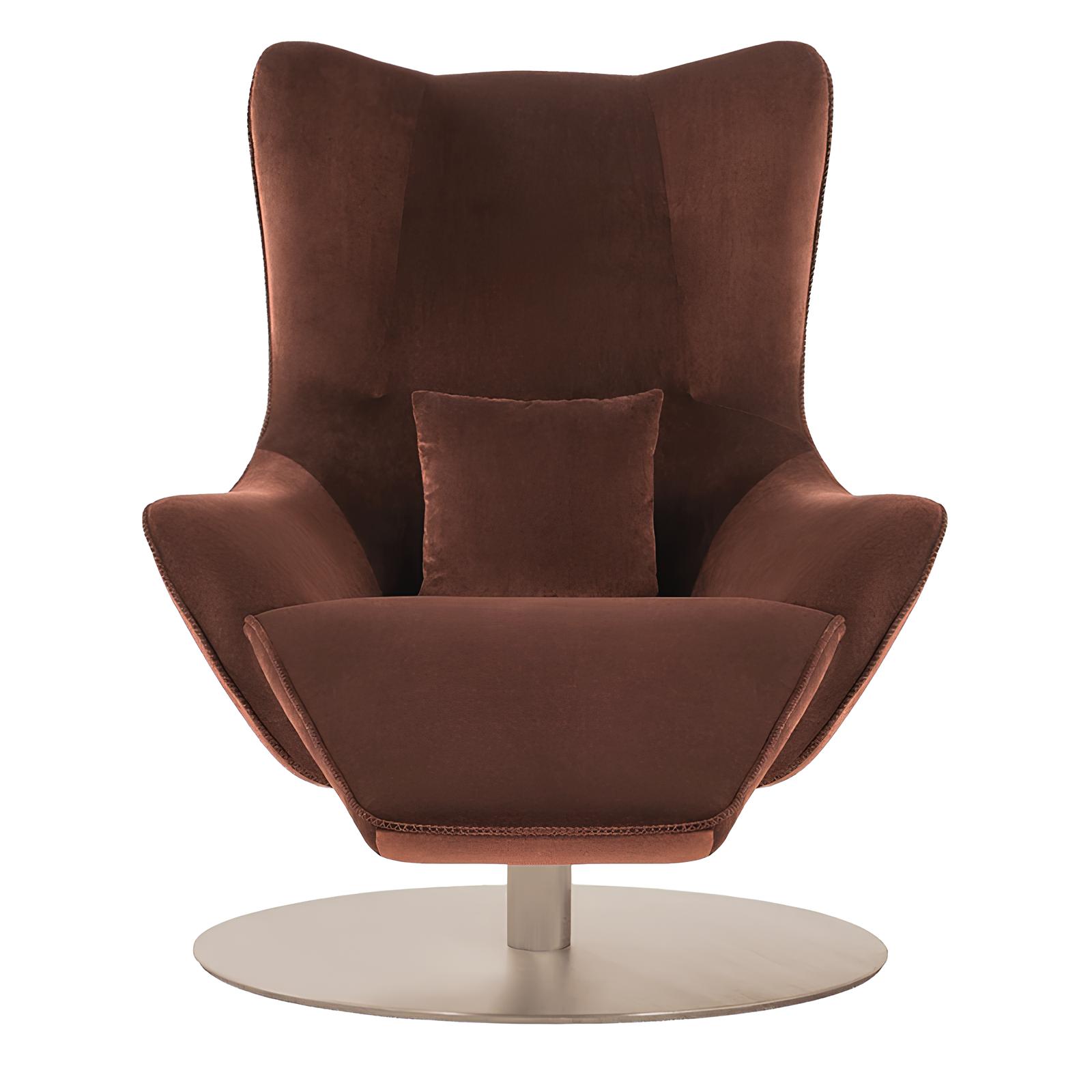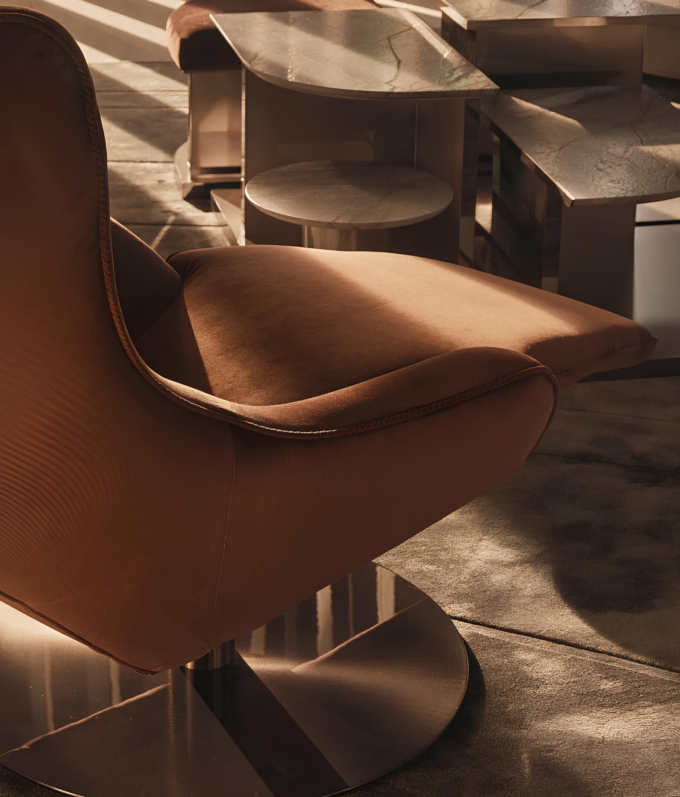 Стальная поворотная база снабжена плавным механизмом вращения, что делает использование кресла ещё более удобным и функциональным. Доступны различные варианты отделки металла — от полированного блеска до сатинированной матовости, а также эксклюзивные исполнения от Visionnaire.