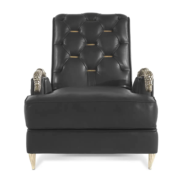 Подлокотники-змеи и ножки кресла отлиты из латуни и покрыты фирменной отделкой Snakeskin Gold, сочетающей в себе художественную выразительность и техническую точность исполнения. Их скульптурная проработка превращает функциональные элементы в подлинные арт-объекты. Опоры кресла органично дополняют композицию, придавая устойчивость и визуальное равновесие.