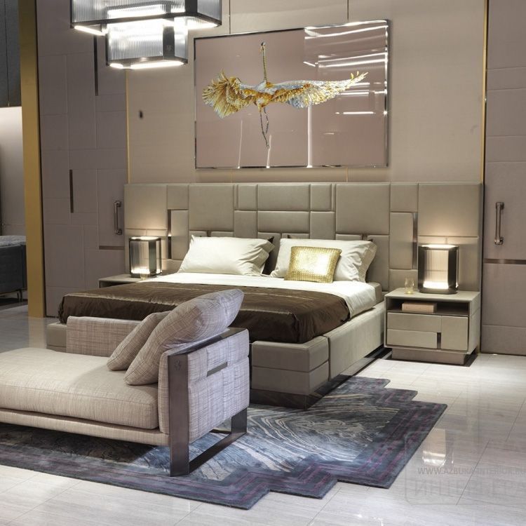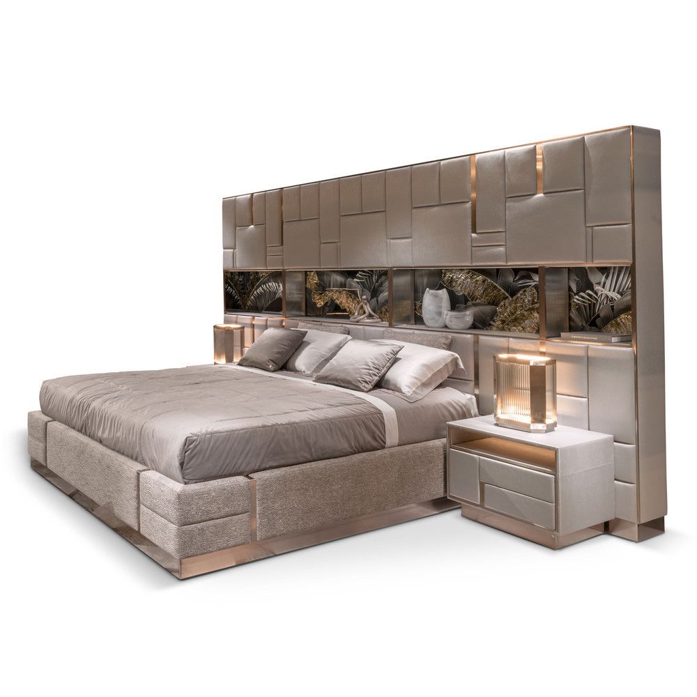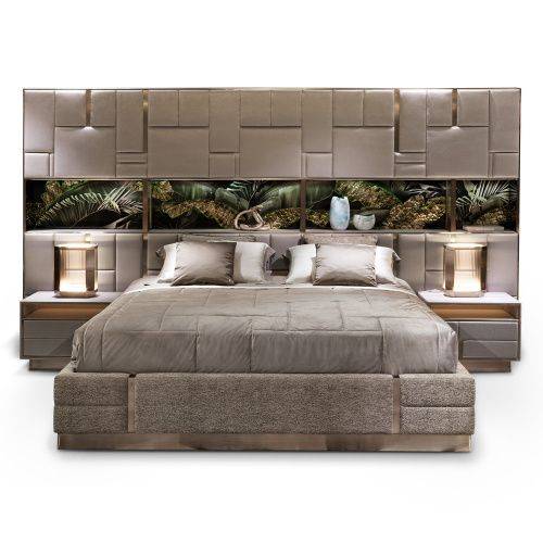 Отличительная черта кровати Beloved – широкое изголовье с мягкими панелями, выложенными геометрическим рисунком. Основание и вставки из сатинированной нержавеющей стали с выгравированным логотипом. Кровать обита кожей или тканью.