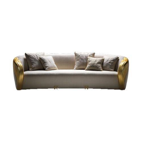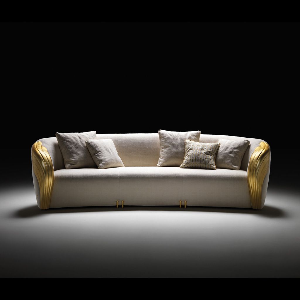 Трехместный диван в стиле ар-деко от итальянского бренда Elledue. Обивка в ассортименте, возможны: бархат, шелк, нубук, хлопок и пр. Характерная деталь – подлокотники в форме крыльев с отделкой из листового золота, согласующиеся с маленькими металлическими ножками того же теплого золотистого тона.