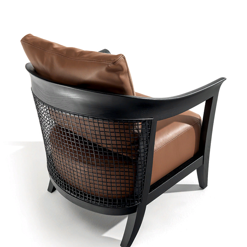 Каркас изготовлен из цельной древесины ясеня, подвергнутой профилированию и пантографированию на станках с ЧПУ. Окрашен в черный или коричневый норковый цвет материалами на водной основе. Задняя сторона кресла представляет собой переплетение из тонко выделанной кожи с полированной внешней поверхностью.