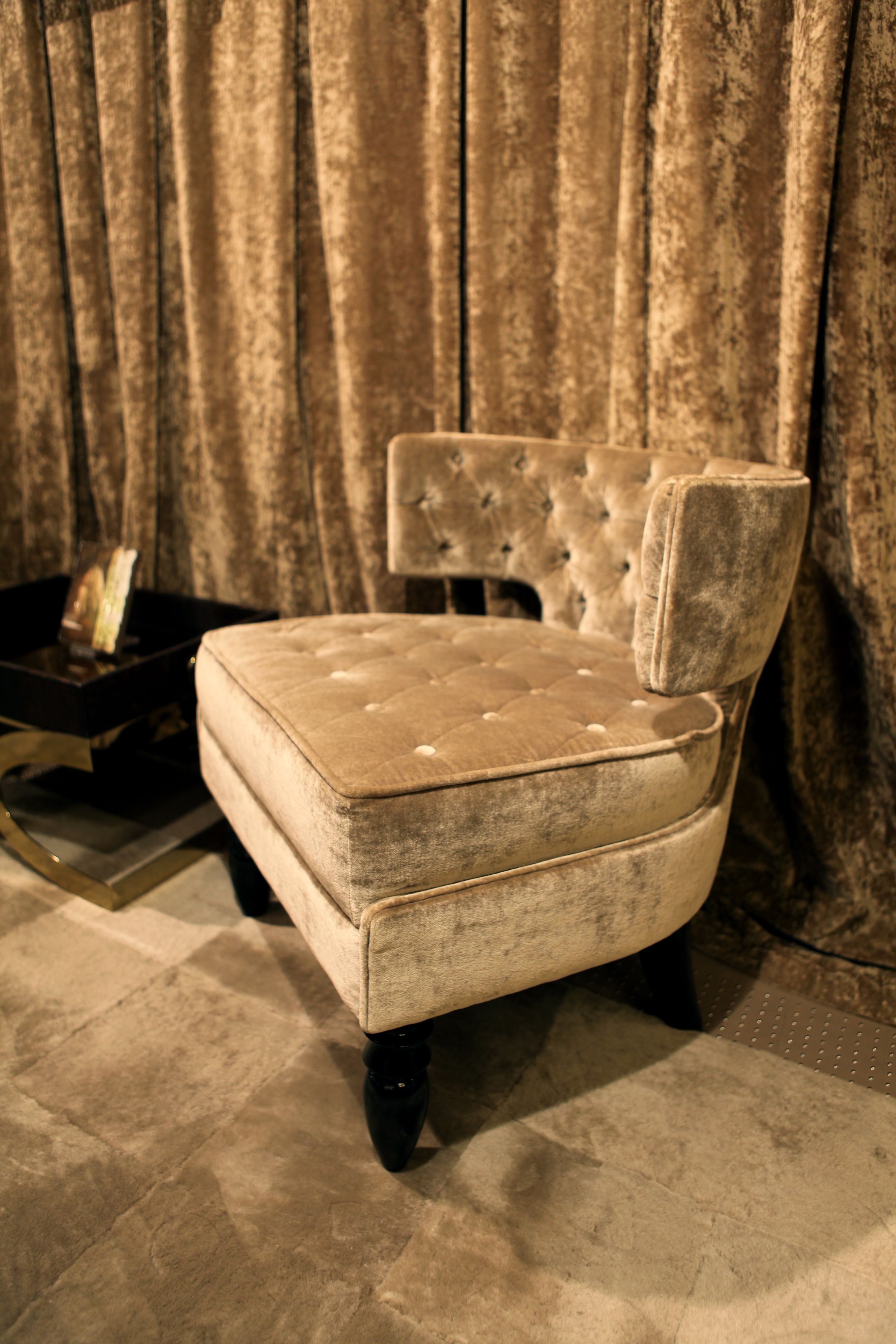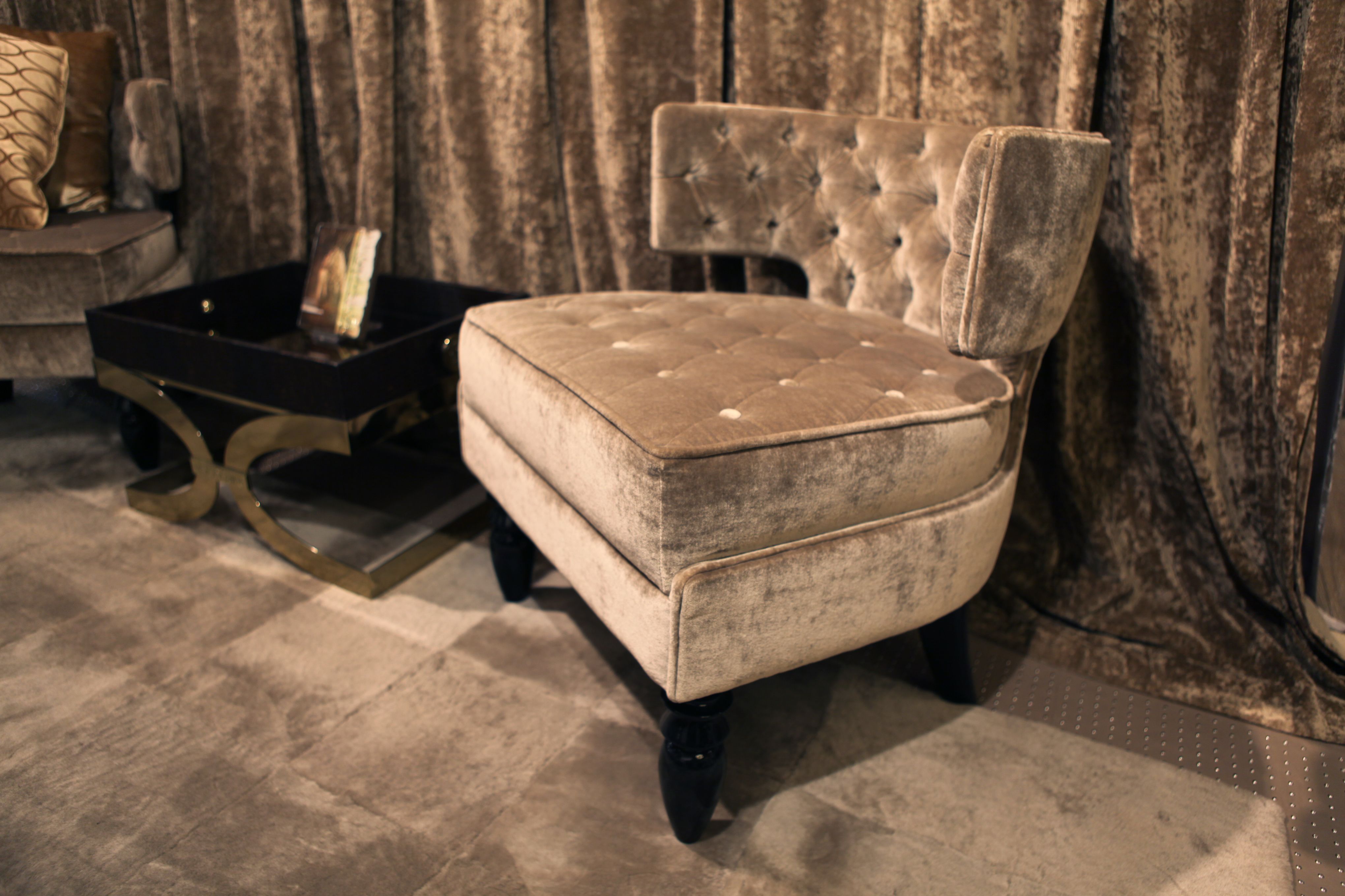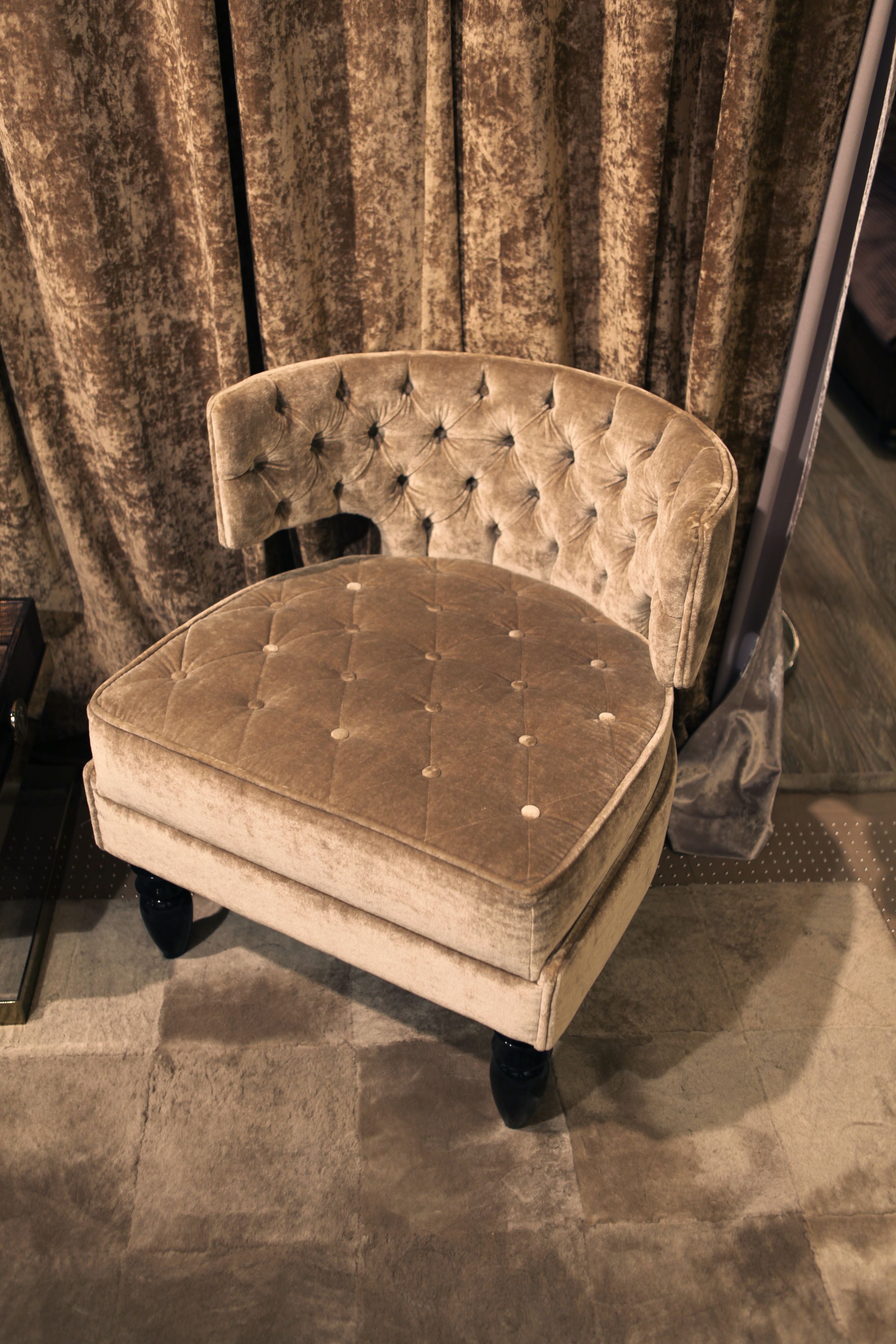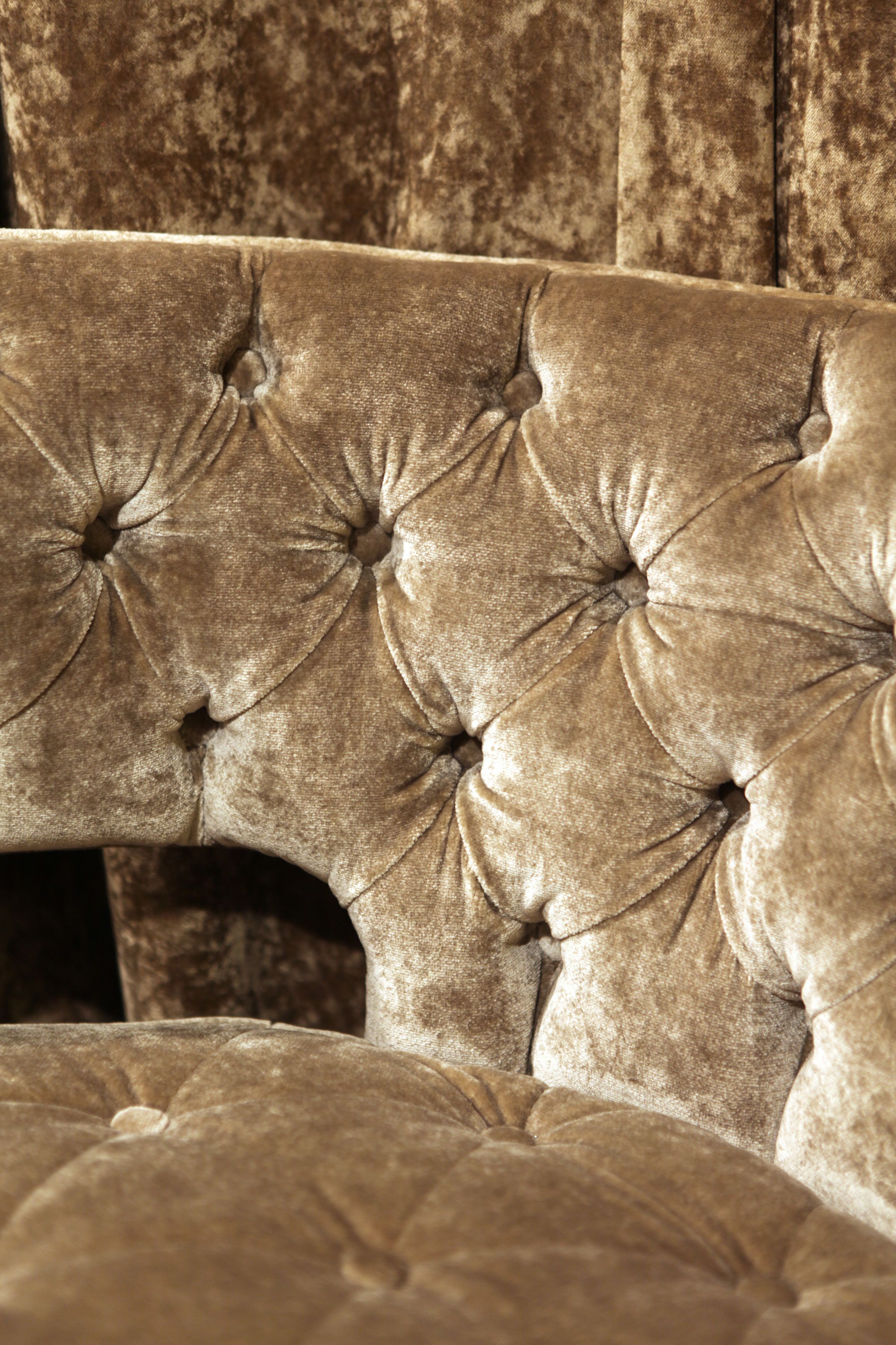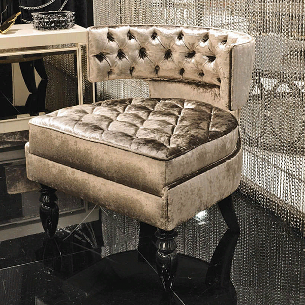 Деревянный каркас, возвышающийся на фигурных лакированных ножках, задрапирован в дорогую ткань с отливом, из которой выполнена отделка спинки и большой пуф-сидение. Полуоткрытая дуга спинки эксклюзивного кресла манит нежными объятиями, обещает сохранить свободу движений и в одночасье быть крепкой, удобной опорой. Техника каретной стяжки, как и декоративная прострочка сидения, подчеркивают пышные, богатые формы кресла MONROE Visionnaire.