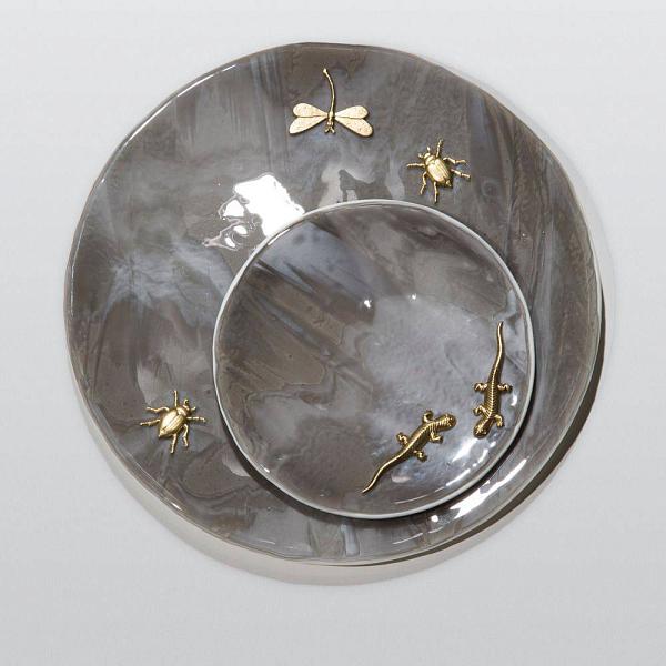 Блюдо из глянцевой керамики ручной работы в мраморно - зеленом цвете или в сером. Украшено рисунком стрекозы и пчелы. Дизайнер La Conca.
