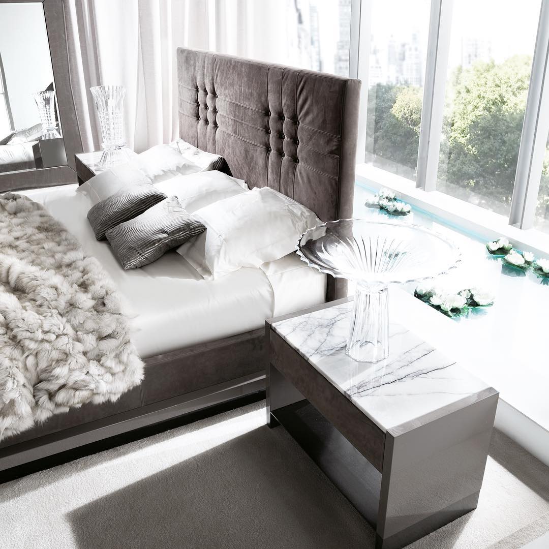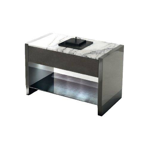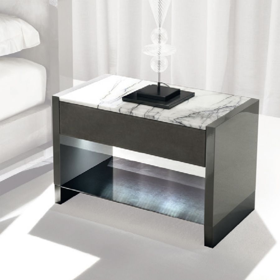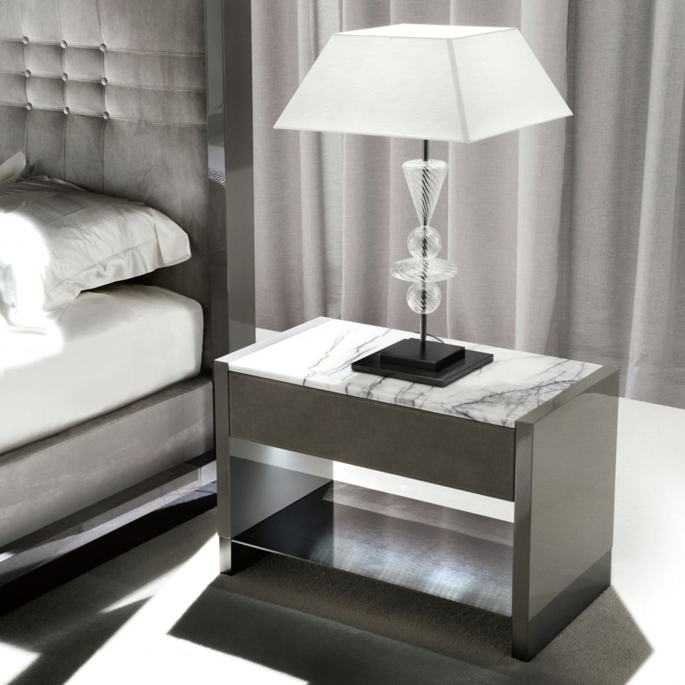 Прикроватная тумбочка с глянцевым полиэфирным покрытием серого цвета и мраморной столешницей. Тумбочка оборудована одним полностью выдвижным ящиком, дно которого обито бархатом, а фронтальная часть — нубуком с защитным покрытием. Под столешницей расположена сенсорная светодиодная система освещения. Основание тумбочки и ее ножки изготовлены из никелированной стали черного цвета. Основание декорировано логотипом Giorgio Collection.
