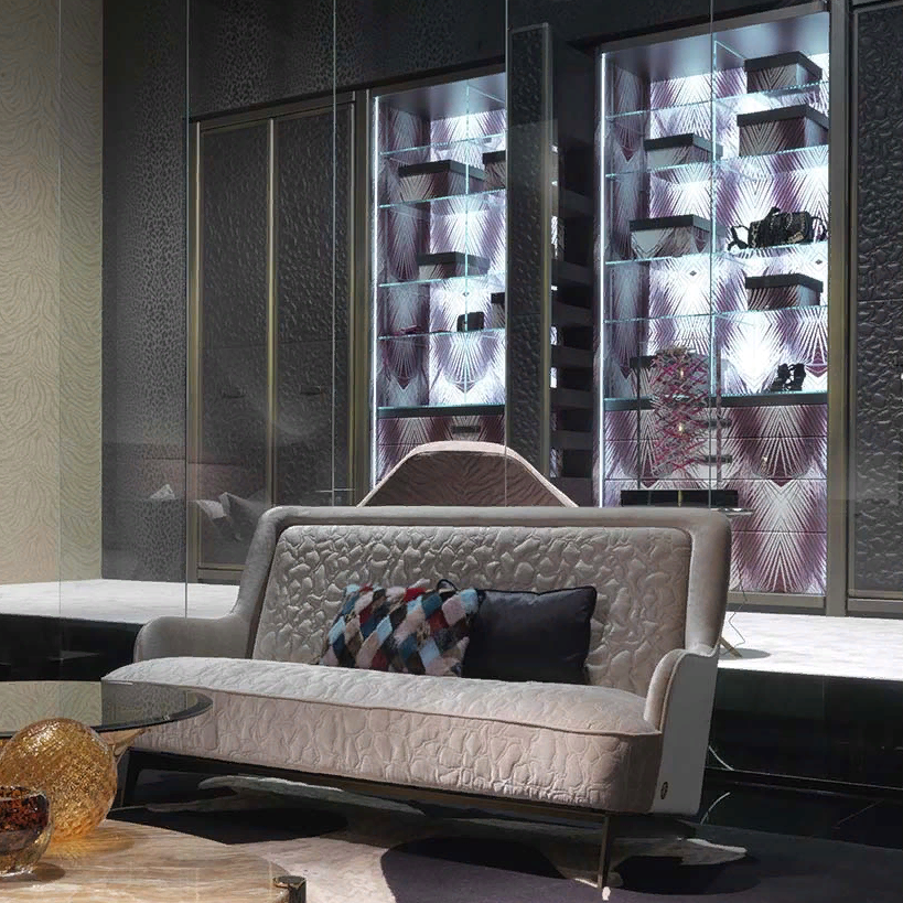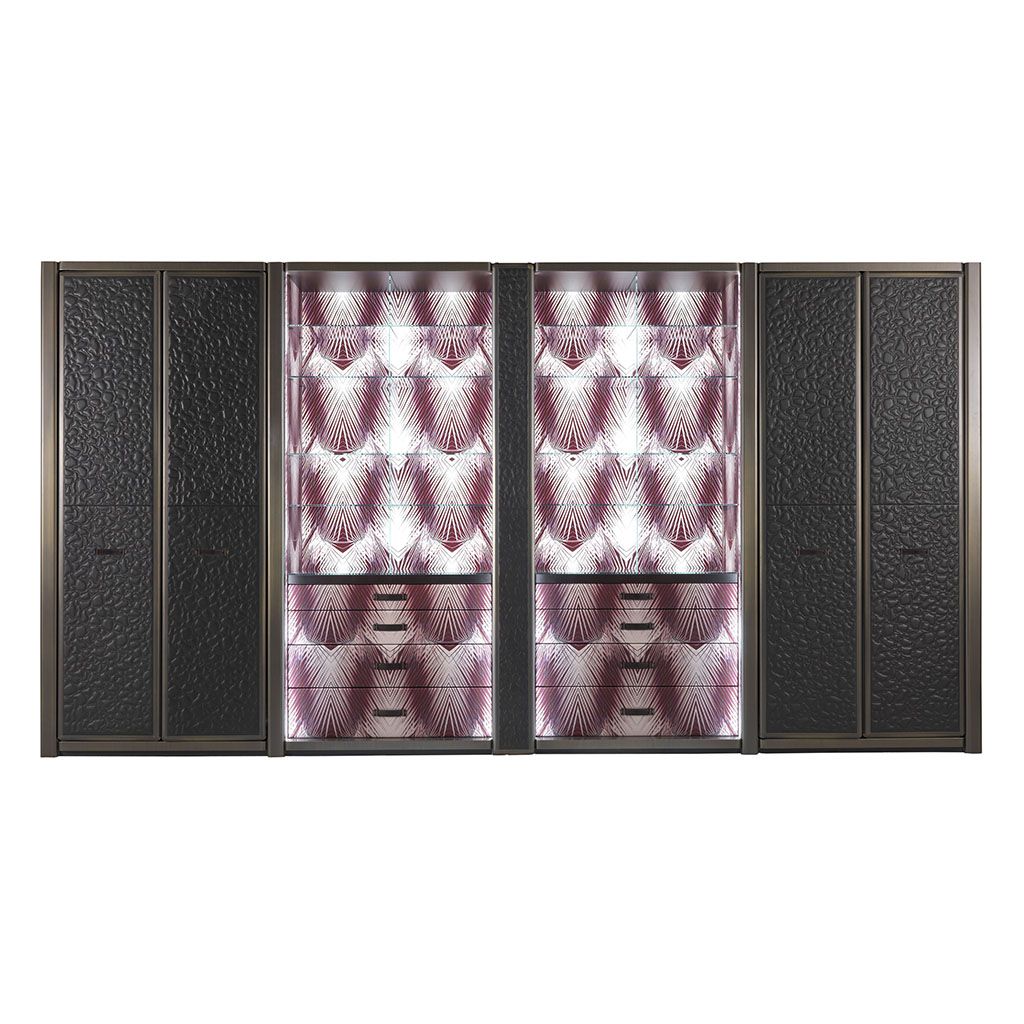 Модульная гардеробная по индивидуальному заказу. Структура из многослойного дерева. Доступен во всех тканях и коже, а также в отделке шпоном из коллекции Roberto Cavalli Home. В боковые панели интегрированы светодиоды. Латунные ручки с золотой или платиновой отделкой. Металлические элементы доступны во всех отделках из коллекции.