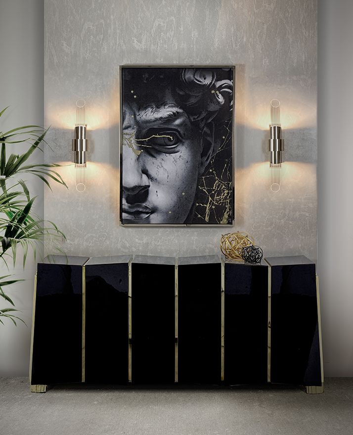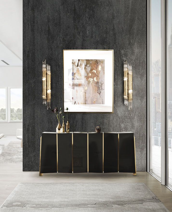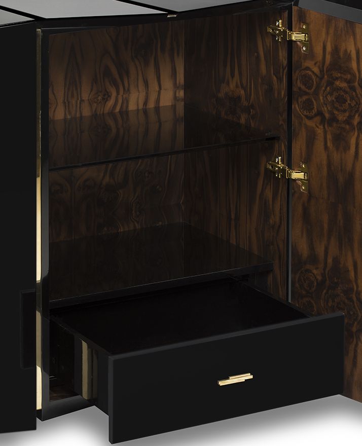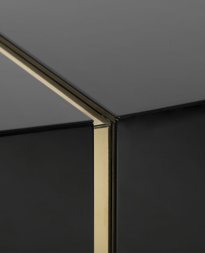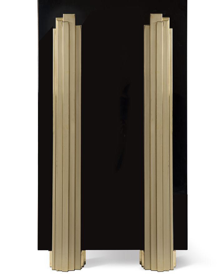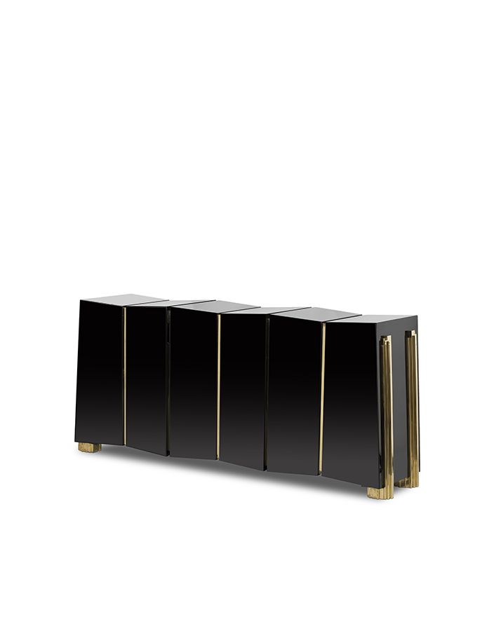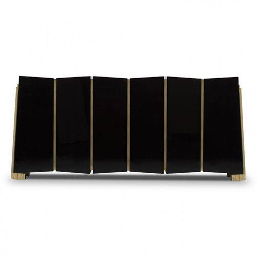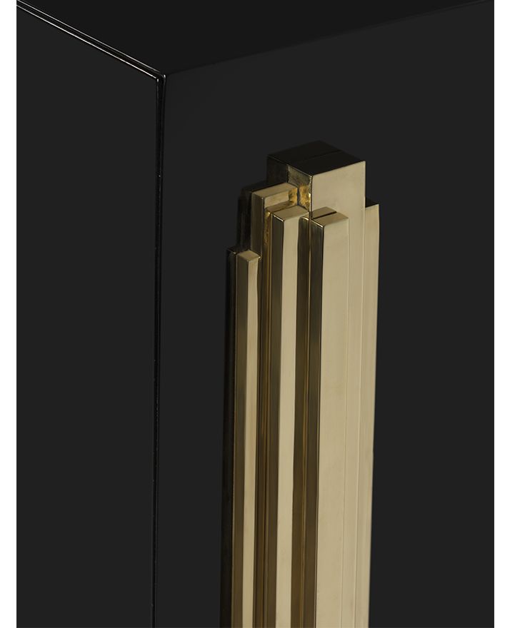 Отправной точкой для дизайна серванта Darian стала форма щита. Асимметричные блоки из древесины, покрытой черным лаком, объединены латунными элементами. По бокам – устойчивые многосложные колонны из полированной латуни. Для создания этого предмета требовались неординарные знания технологий металлообработки и резьбы по дереву.