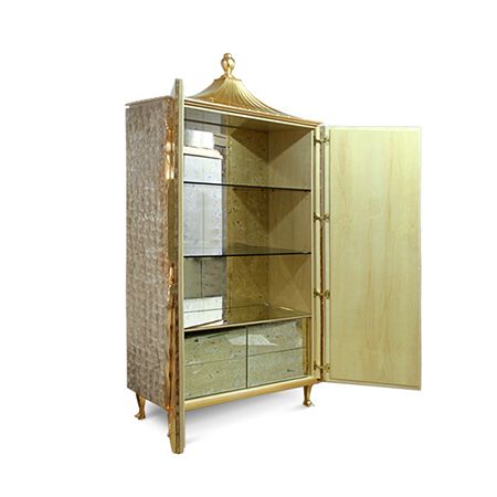 Структура из перламутра цвета слоновой кости. Внутренняя часть спинки, детали и том – сусальное золото с глянцевой отделкой. Основание – полированная латунь с глянцевым покрытием. Внутри комода – ящички, покрытые состаренным зеркалом, 2 регулируемые полки из бронзового стекла.