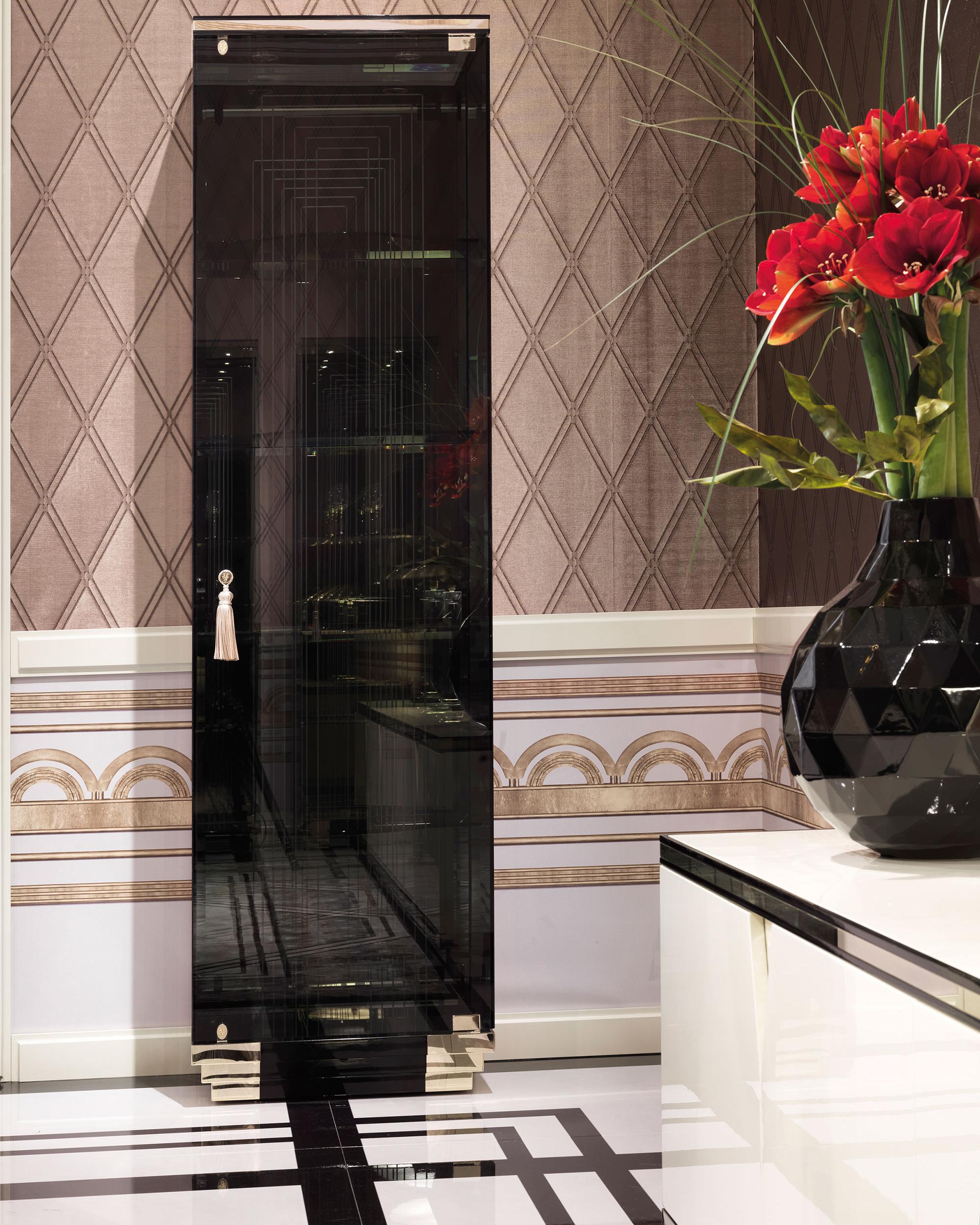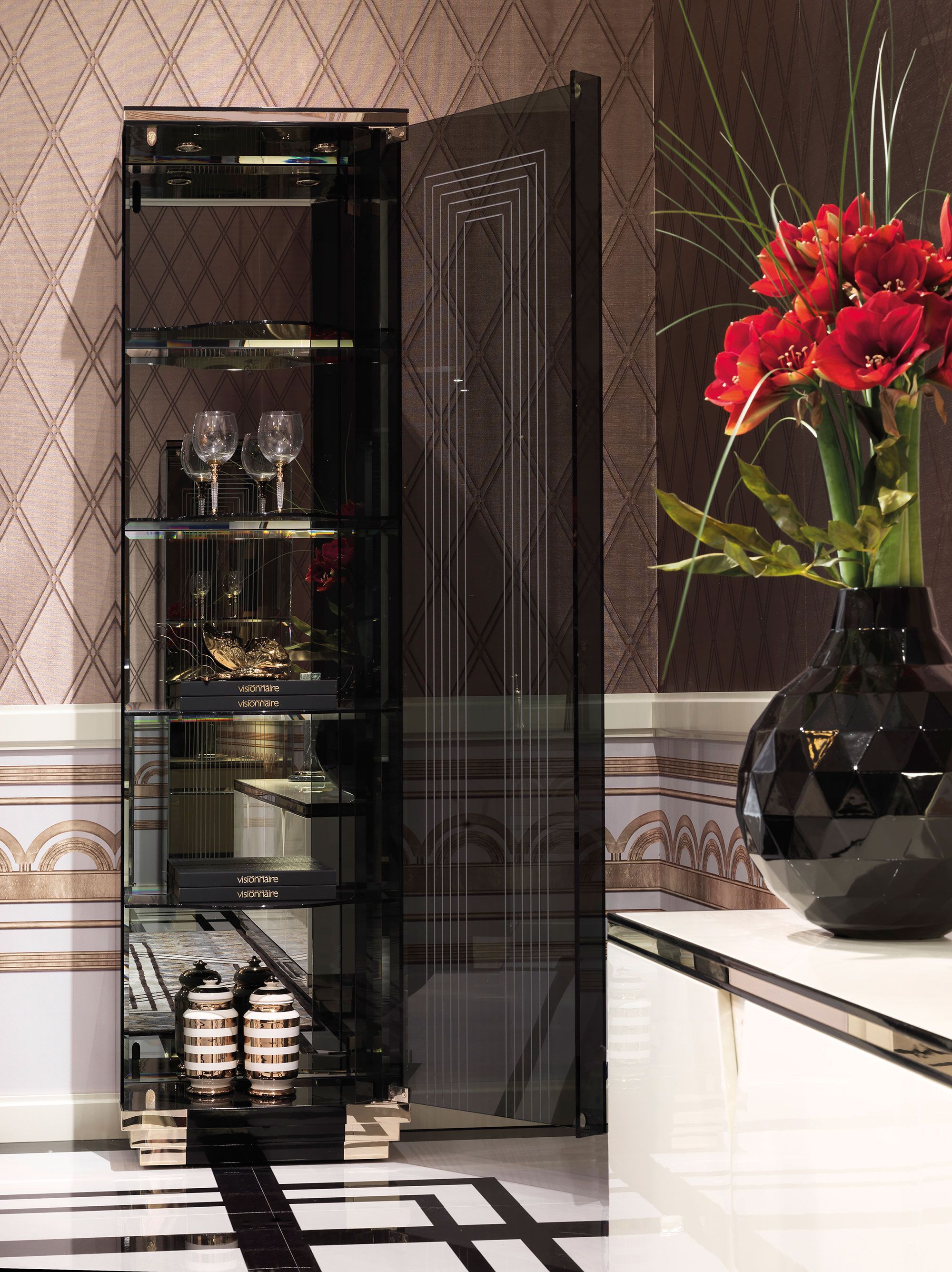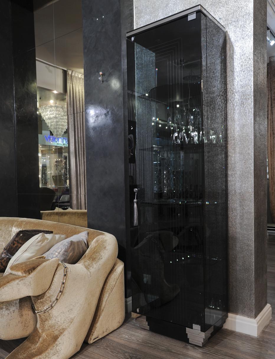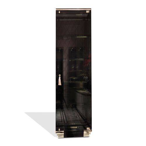 Витрина с трехсторонней дверью из стекла толщиной 8мм, сваренного ультрафиолетом; варианты стекла – прозрачное/бронзовое/дымчатое. Каркас – из дерева в лаке. Задняя стенка облицована зеркалом (на выбор – прозрачное/бронзовое/дымчатое). Ручка с кисточкой выполнена из алюминия и кожи. В плинтусе – светодиодная подсветка с датчиком движения. Все металлические детали доступны в бронзе, золоте и черном никеле. Шкаф-колонна должен быть прикреплен к стене.