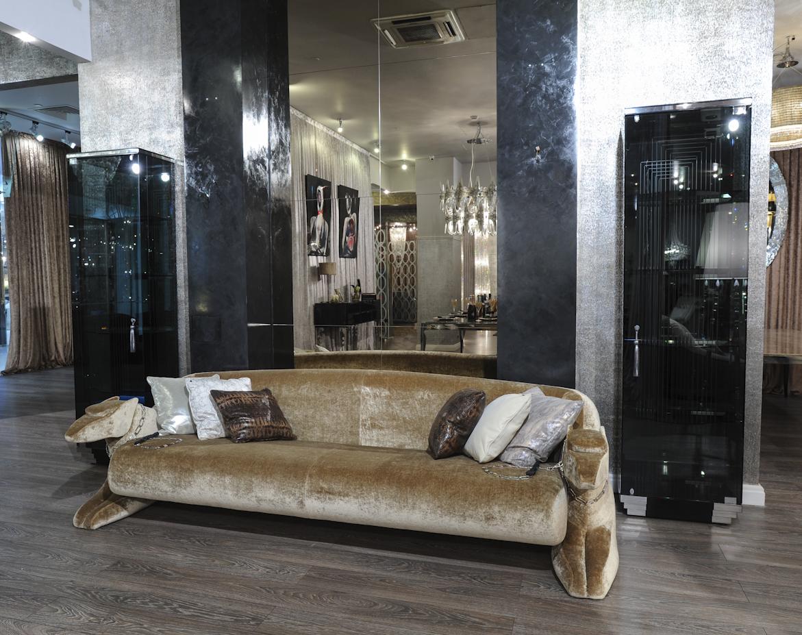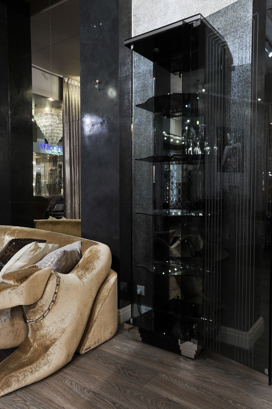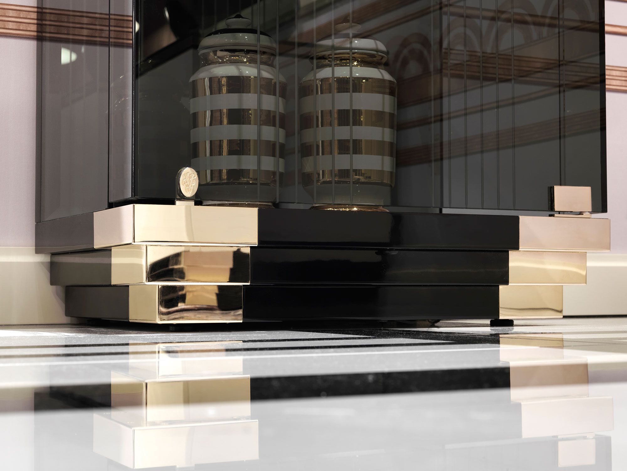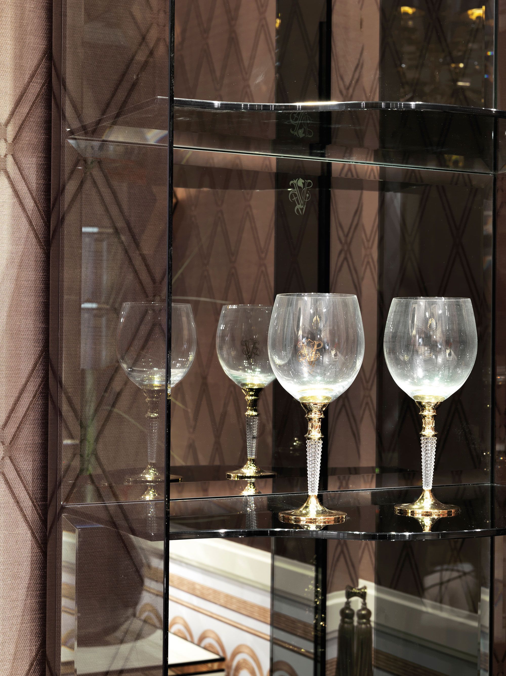 Витрина с трехсторонней дверью из стекла толщиной 8мм, сваренного ультрафиолетом; варианты стекла – прозрачное/бронзовое/дымчатое. Каркас – из дерева в лаке. Задняя стенка облицована зеркалом (на выбор – прозрачное/бронзовое/дымчатое). Ручка с кисточкой выполнена из алюминия и кожи. В плинтусе – светодиодная подсветка с датчиком движения. Все металлические детали доступны в бронзе, золоте и черном никеле. Шкаф-колонна должен быть прикреплен к стене.