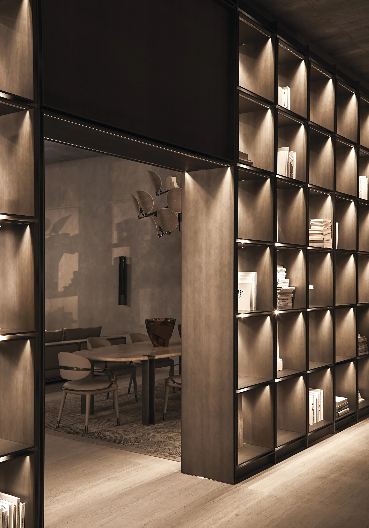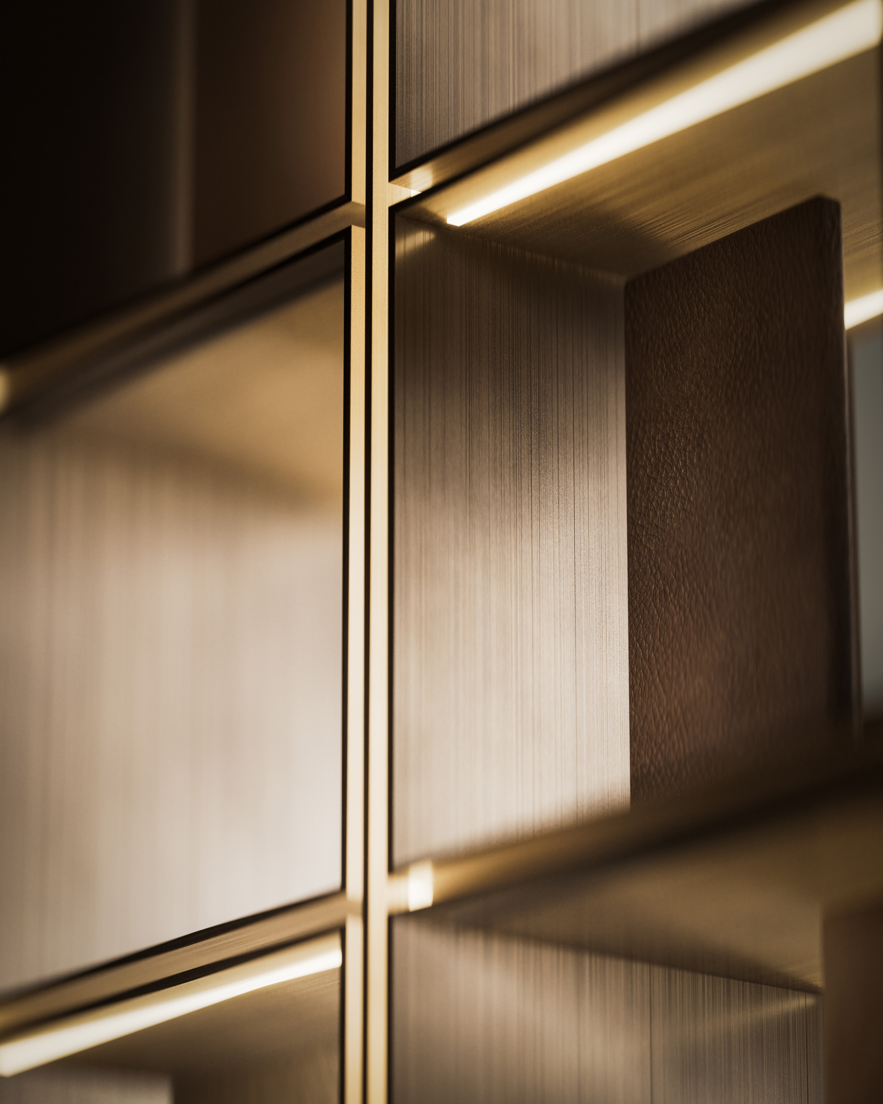 В конструкцию вертикальных панелей и ячеек интегрированы тонкие LED-планки, встроенные прямо в толщу алюминия. Каждая LED-полоса управляется отдельно и поддерживает настройку индивидуальных световых сценариев через систему DMX (Digital Multiplex). По запросу возможно подключение к системе «умного дома», что делает C-Square не просто мебелью, а элементом интеллектуальной среды.