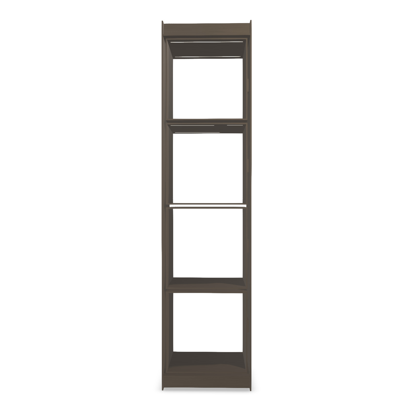 Вся алюминиевая конструкция покрыта сатинированным рифлёным напылением цвета "gunmetal" (тёмный графит с металлическим отливом), что придаёт стеллажу премиальную текстуру и подчёркивает его современную эстетическую направленность.