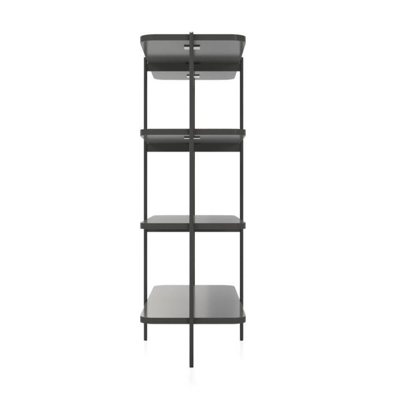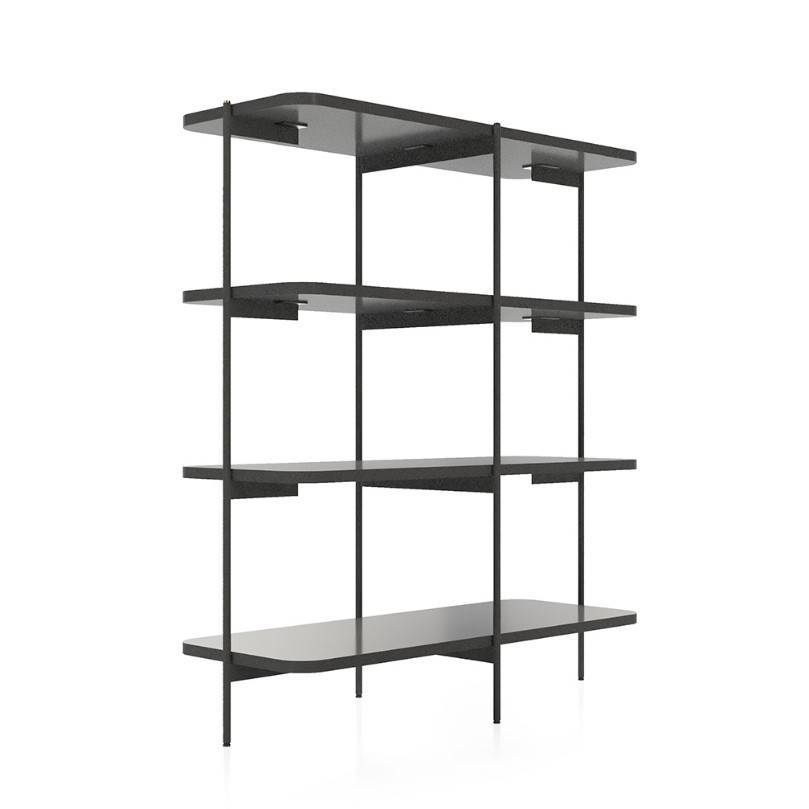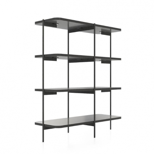 Стеллаж доступен в низкой версии с двумя полками и высокой с четырьмя полками. Столешница из панели ДСП, облицованной натуральным или карбонизированным ясенем, орехом каналетто, термообработанным грецким орехом или покрытой лаком в цветах коллекции с матовой или глянцевой отделкой. Стальные ножки с металлической отделкой из коллекции. Регулируемые наконечники и декоративный элемент – из металла в золотой отделке.