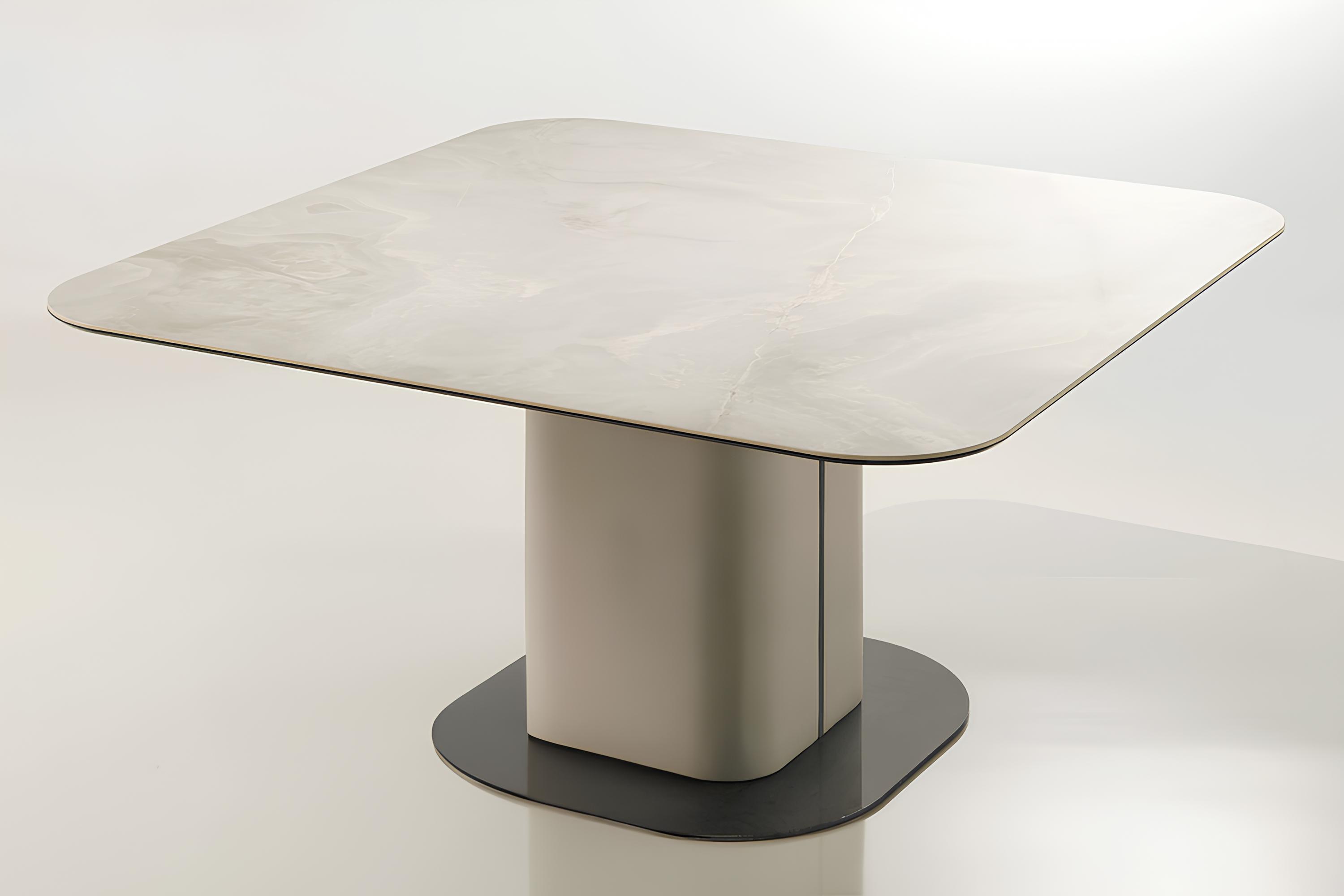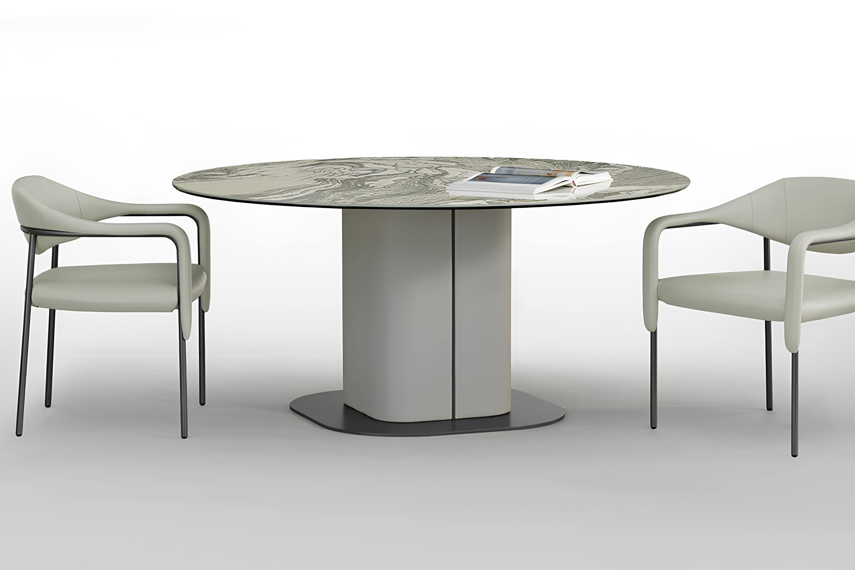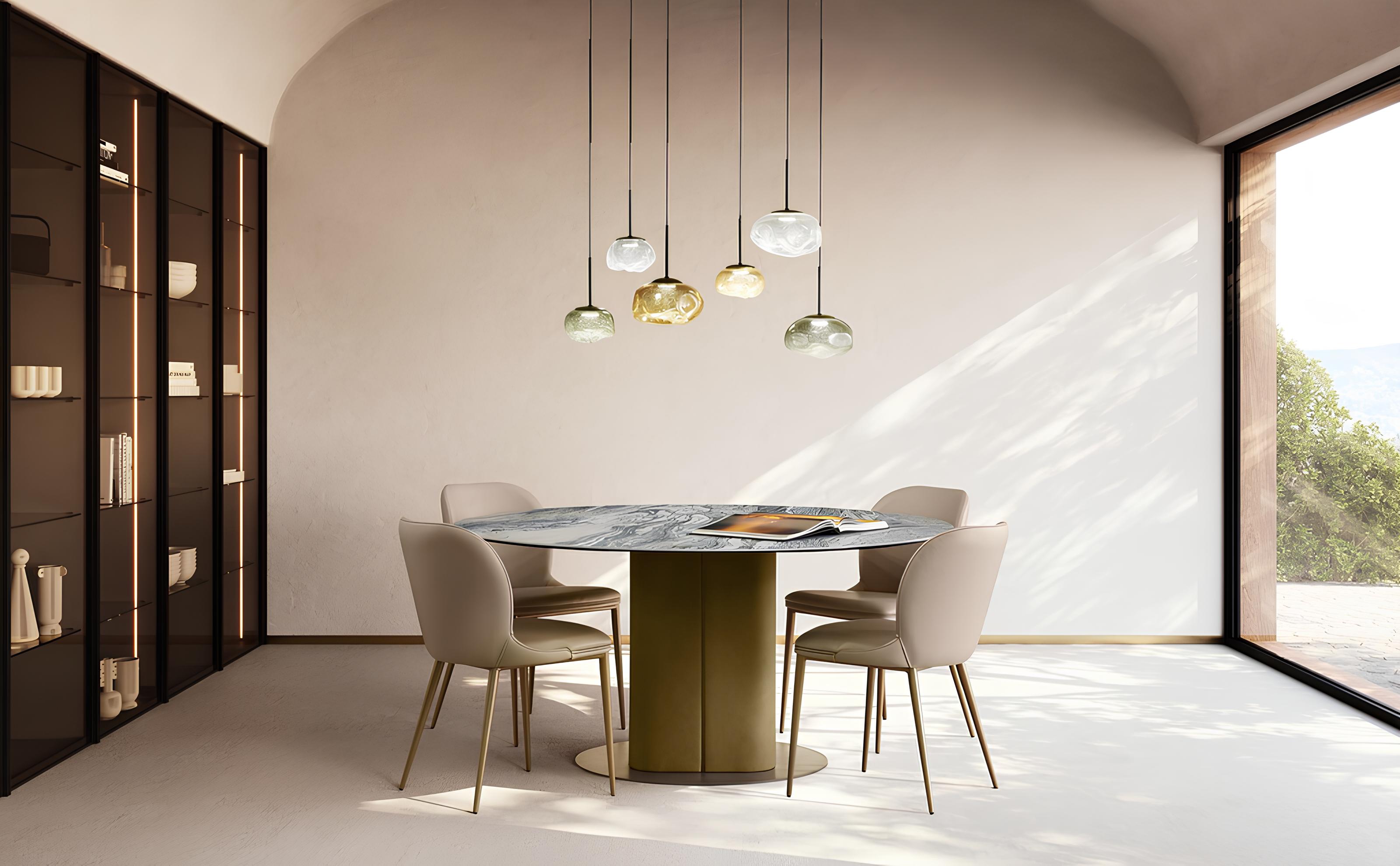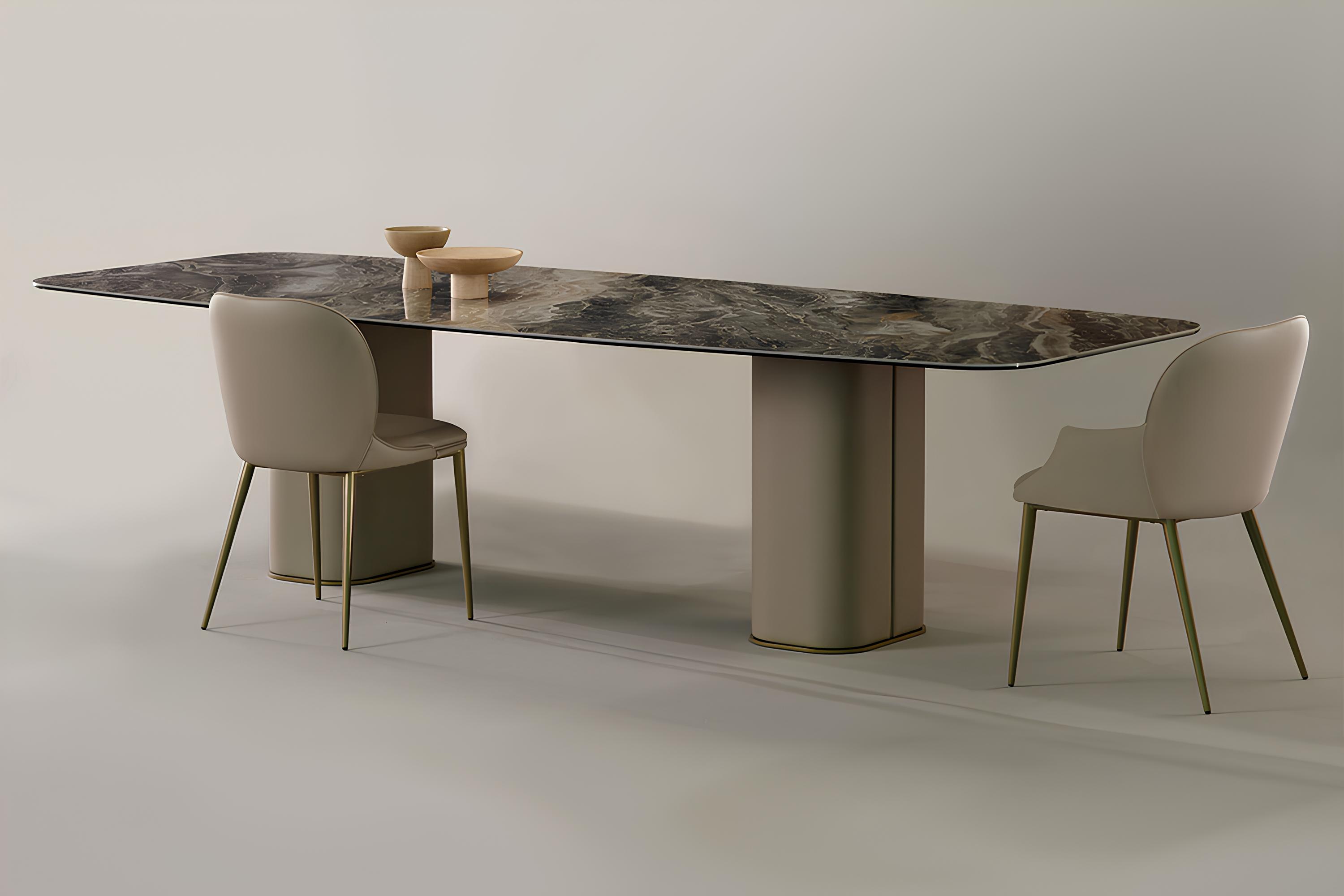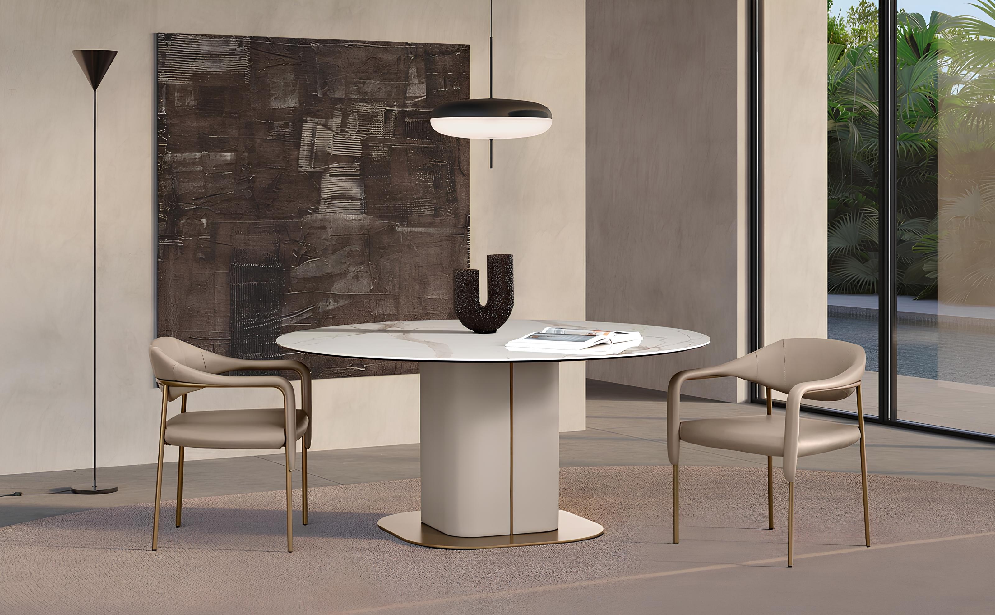 Milos создан как скульптурный объект, способный стать центром композиции в столовой. Его визуальный код — это сочетание: мягких, плавных линий гнутой деревянной базы; благородной кожи, натянутой и обработанной вручную; металлических акцентов, которые подчеркивают архитектурную структуру и эффектной столешницы из стекла, керамики или натурального мрамора.