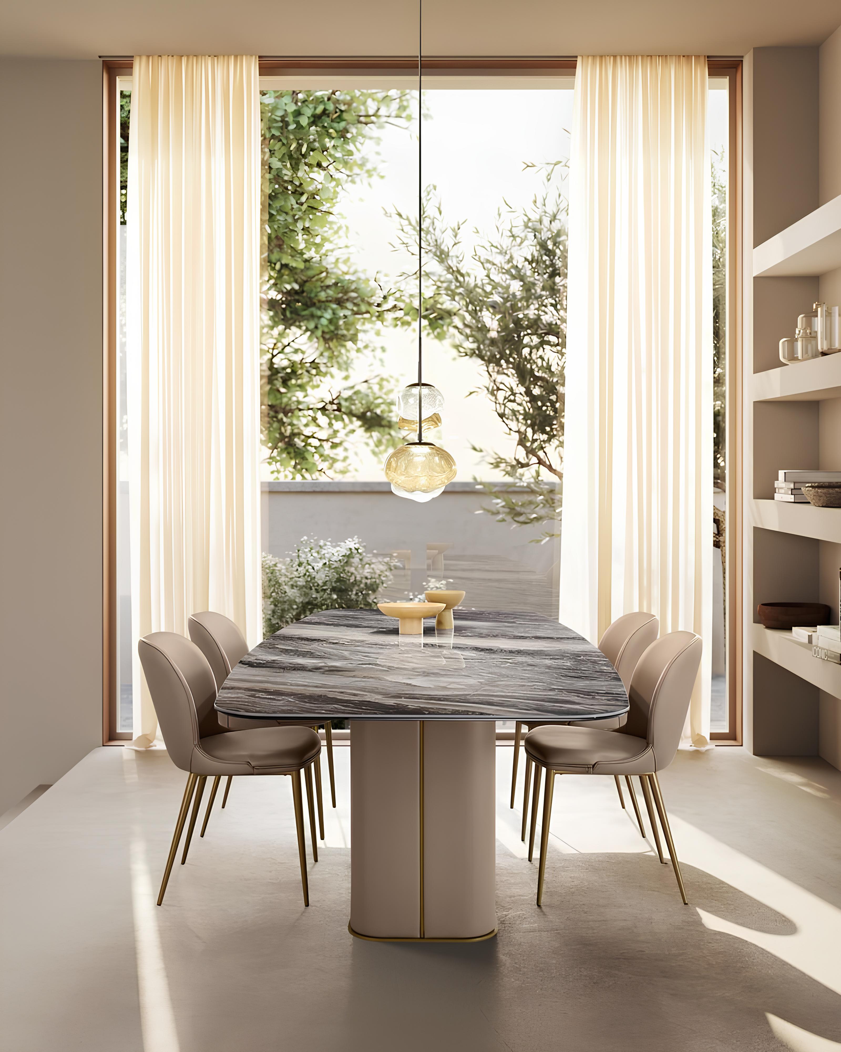Его пластичность позволяет сочетать его как с кожаными стульями, так и с текстильными моделями, создавая выразительные dining-зоны с характером.