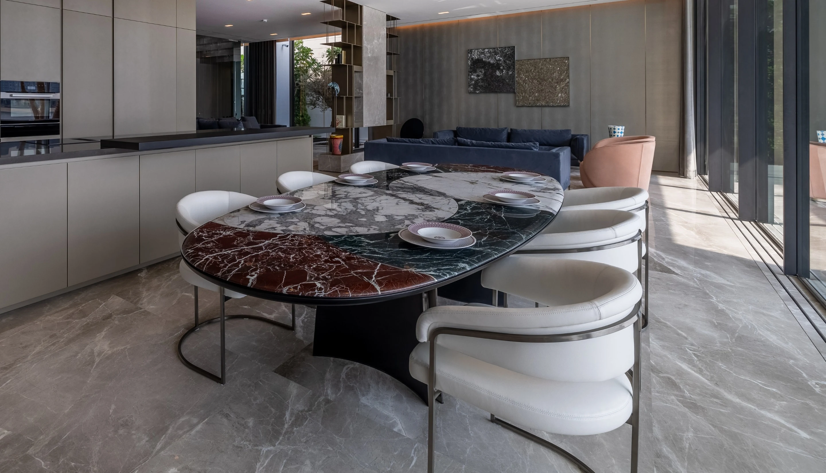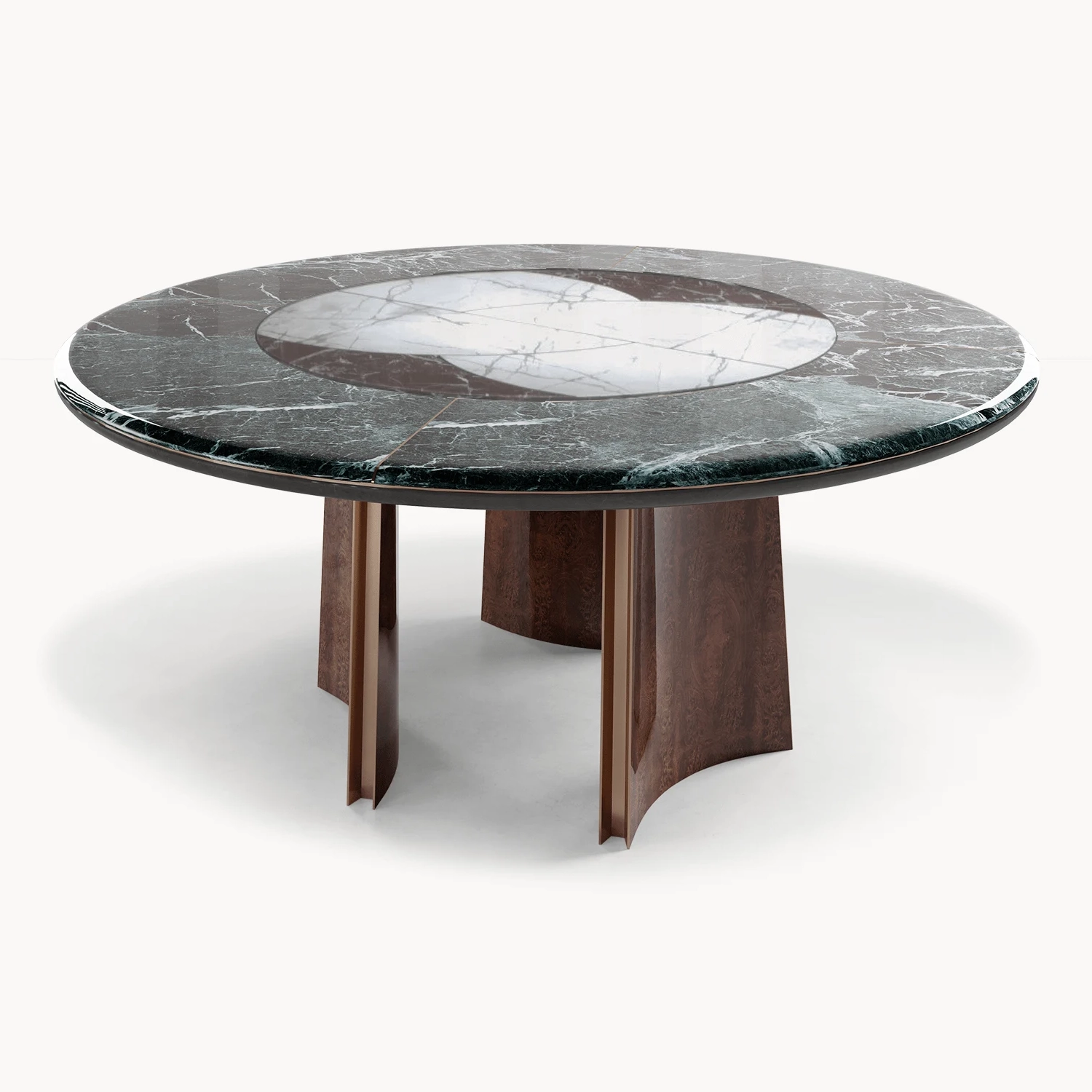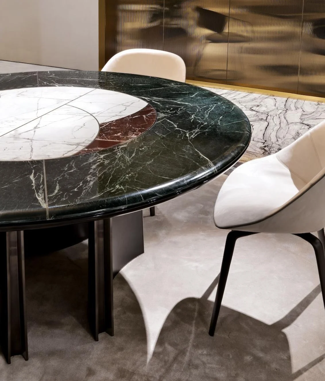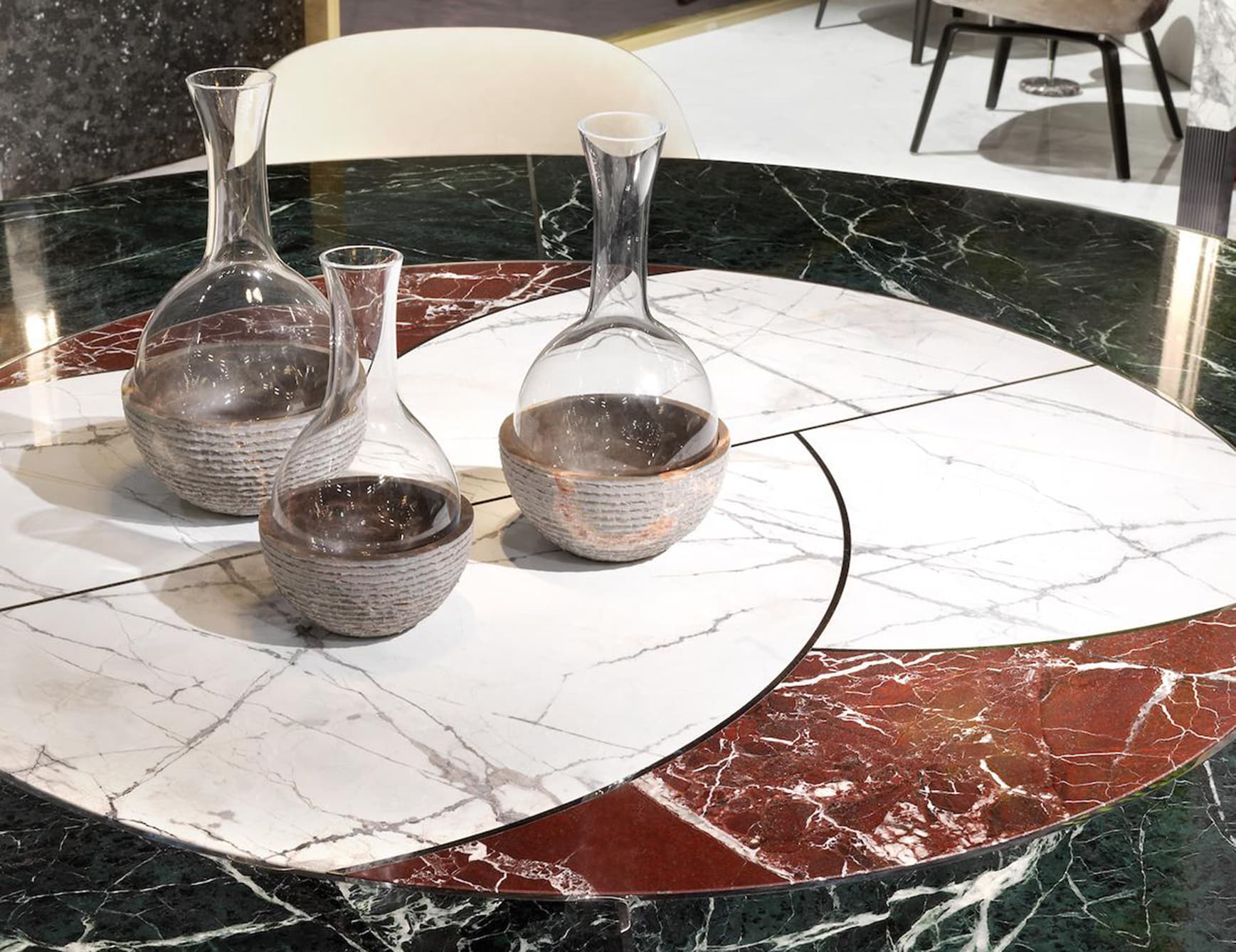 Для удобства сервировки стол может оснащаться поворотной площадкой Lazy Susan, выполненной из того же мрамора, что и столешница, — её можно выбрать в встроенном или отдельностоящем варианте.