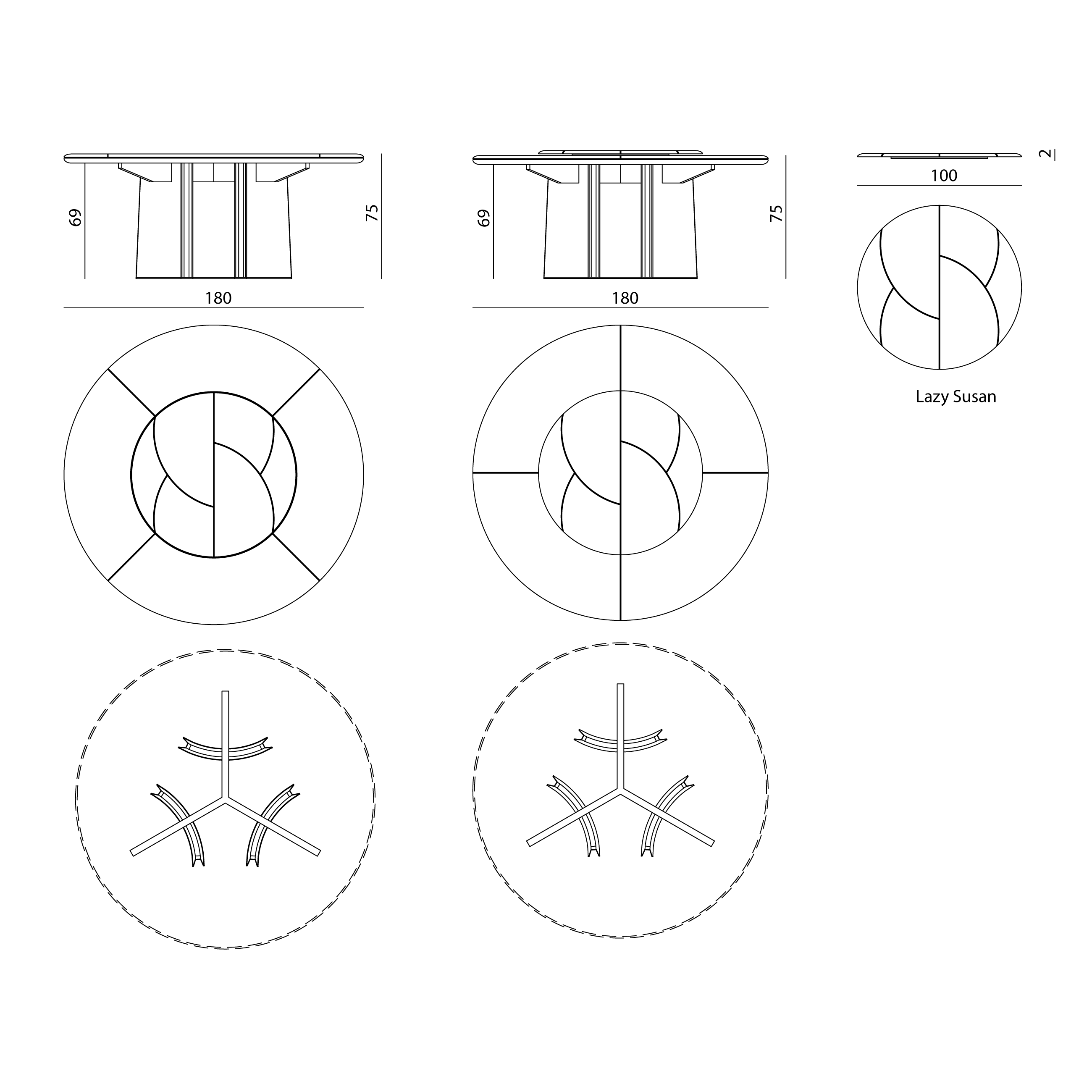 Размеры: круглый Ø180xH75 см, овальный L300xW134xH75 см, Lazy Susan Ø100xTHK5 см.