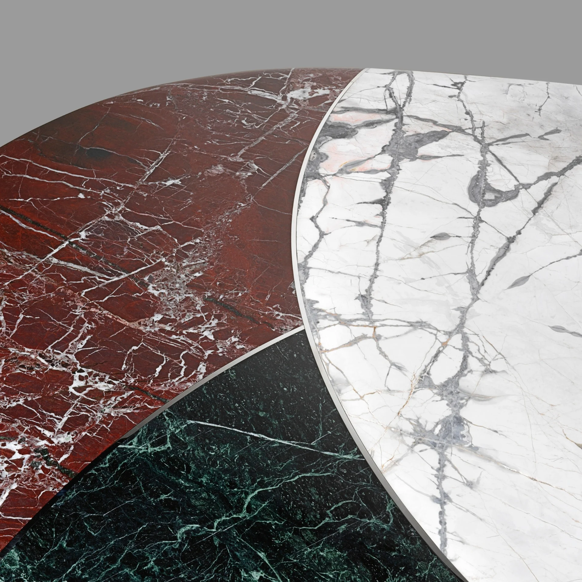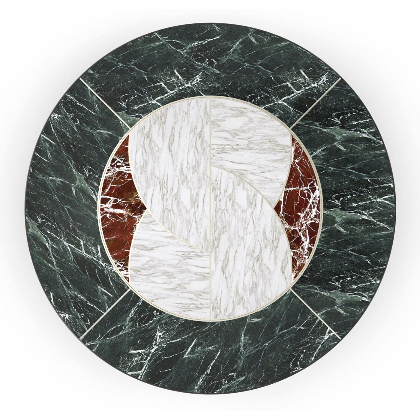 Металлическая рамка из нержавеющей стали обрамляет мраморный диск. Она доступна в различных вариантах фирменных отделок Visionnaire Metal Finishes — от сатинированного никеля до шампанского золота.