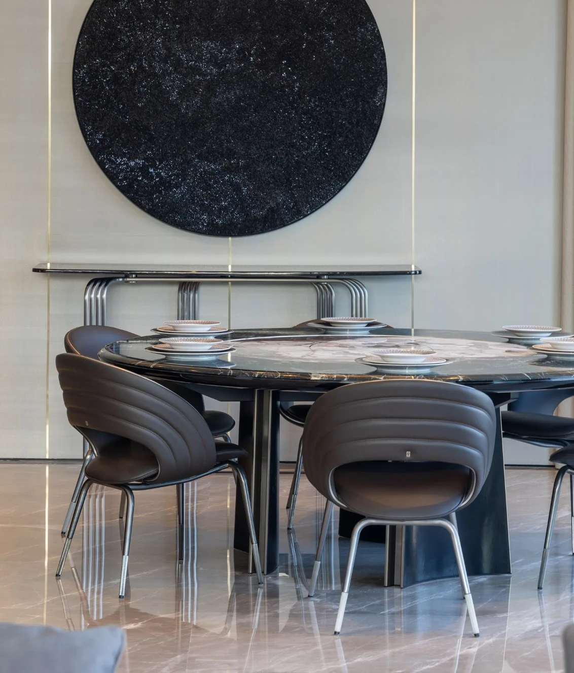 Его присутствие формирует атмосферу торжественности и утончённости, а сочетание мрамора, кожи и металла делает модель центральным элементом интерьерной архитектуры.
