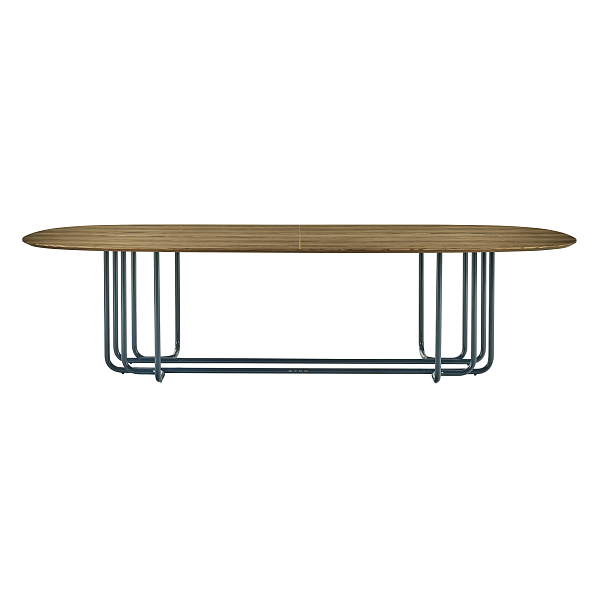 Стол Piping демонстрирует игру противоположностей — плавная изогнутая основа из полированных трубчатых элементов создаёт динамичный образ, где пустоты и объёмы образуют лёгкий, графичный ритм. Контраст к ней составляет деревянная столешница, чья природная текстура придаёт модели теплоту и тактильную выразительность.