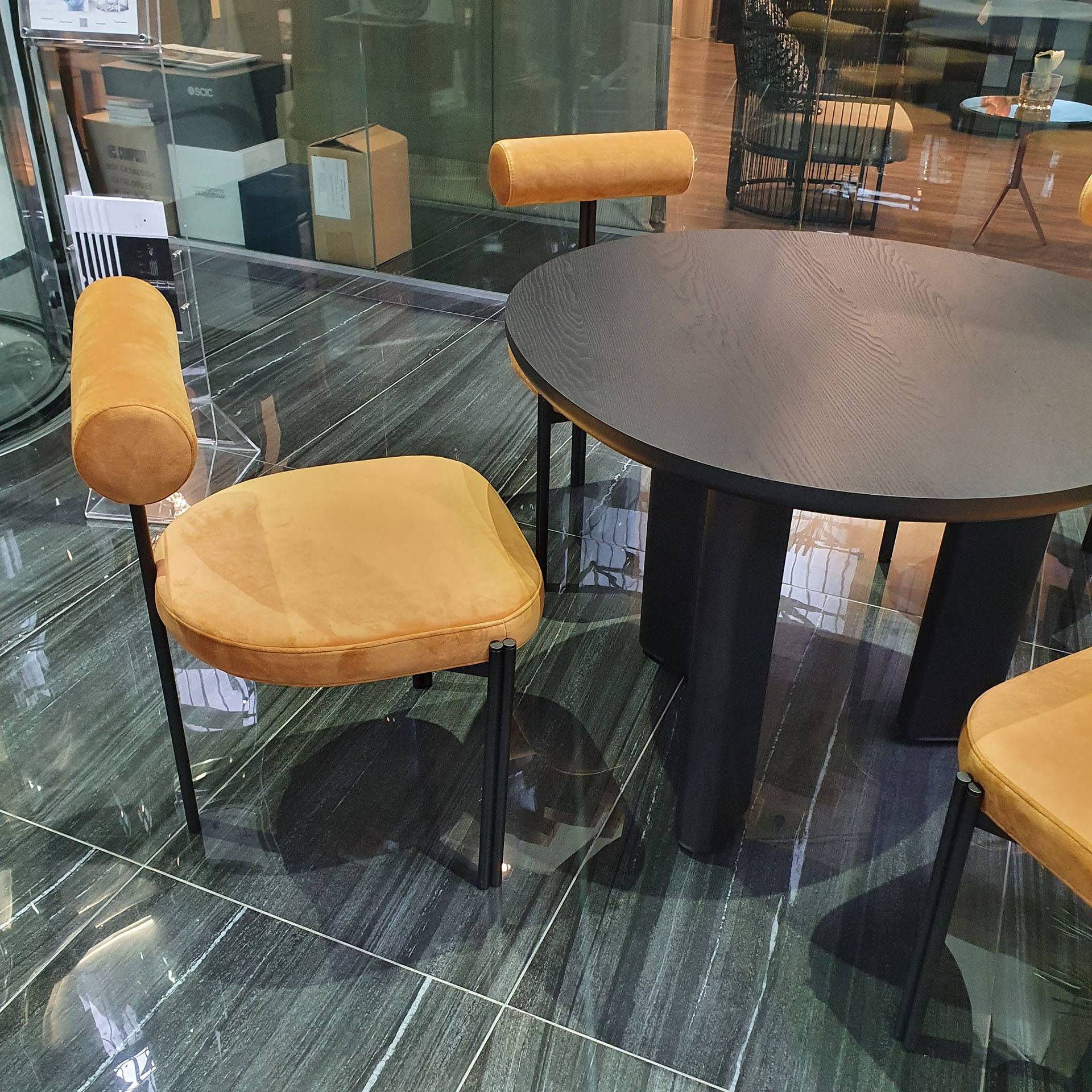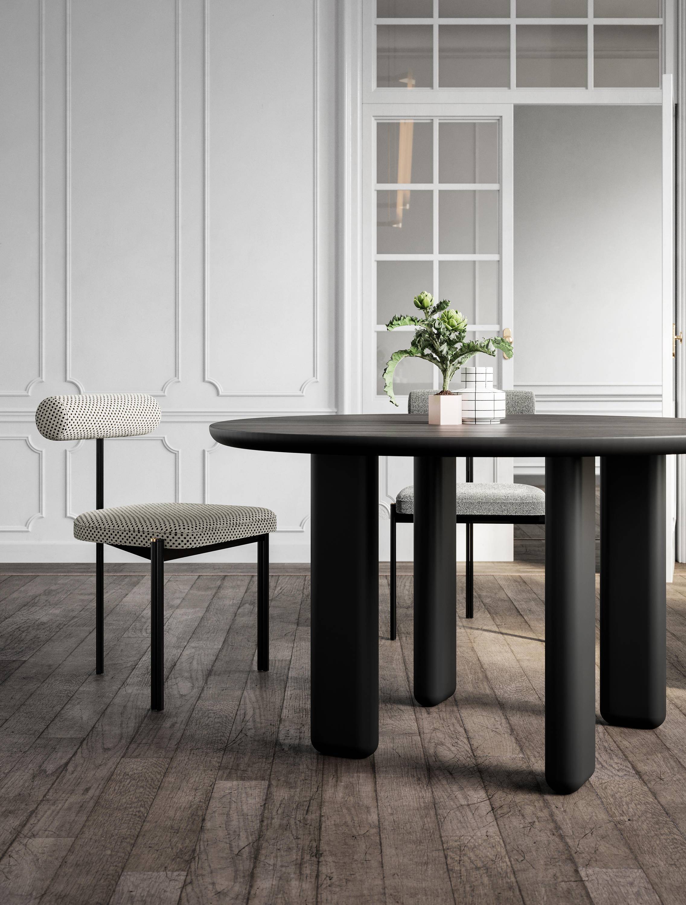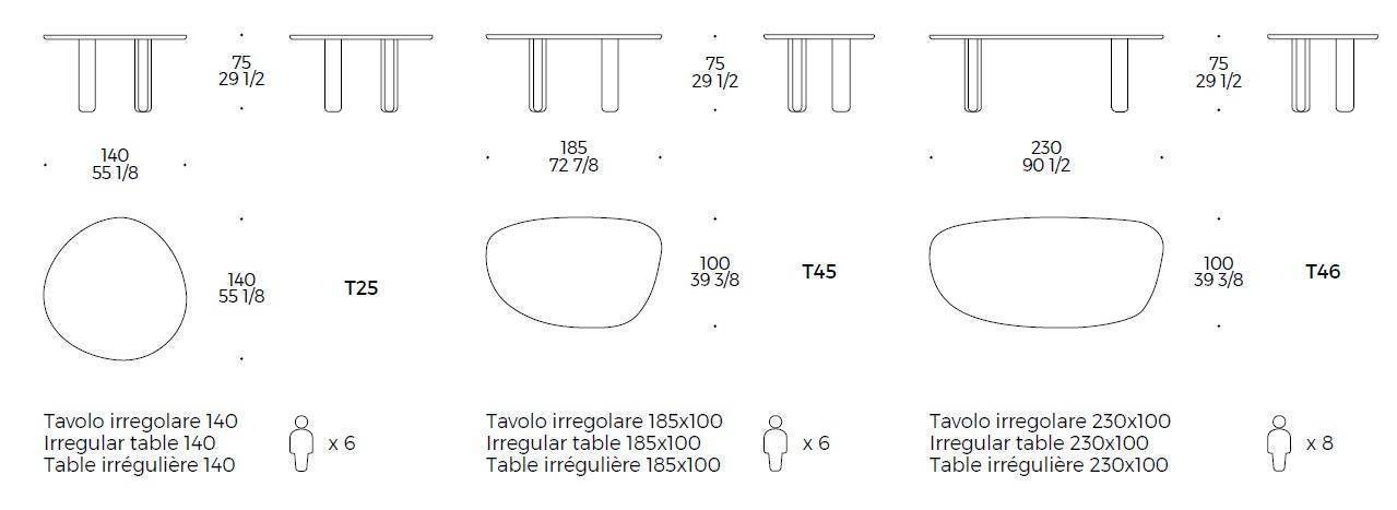 Обеденный стол со столешницей из древесноволокнистых плит, шпонированных натуральным или карбонизированным ясенем, орехом каналетто, термообработанным грецким орехом или покрытых матовым лаком в цветах коллекции. Ножки выполнены из массива ясеня или из древесного волокна средней плотности в покрытии матовым лаком из коллекции в цвете, соответствующим тону столешницы. Стол доступен в разных размерах.