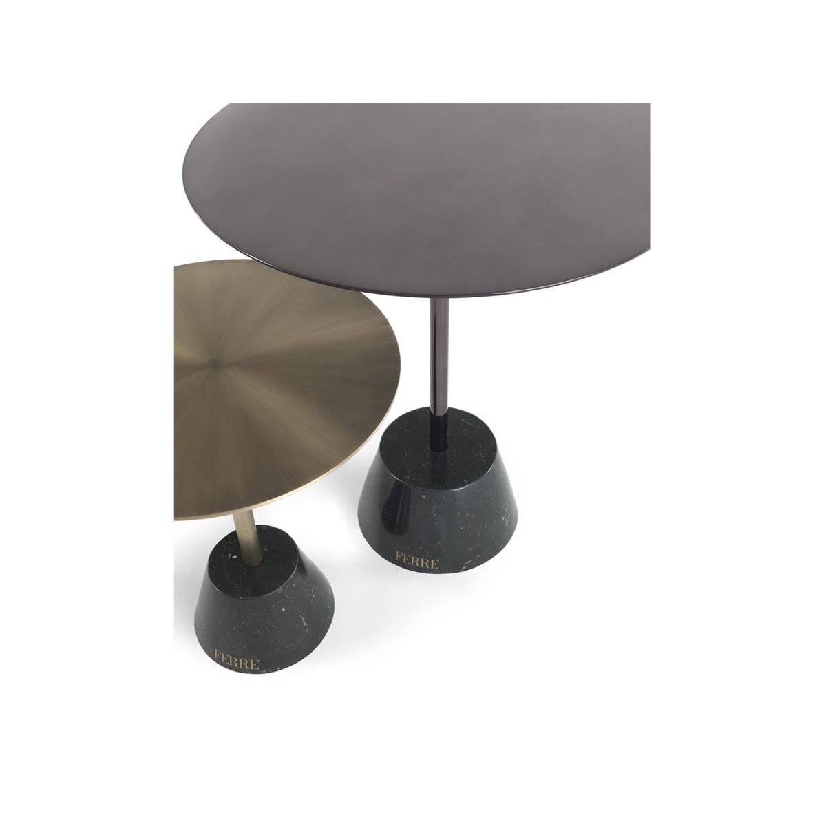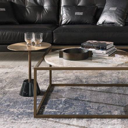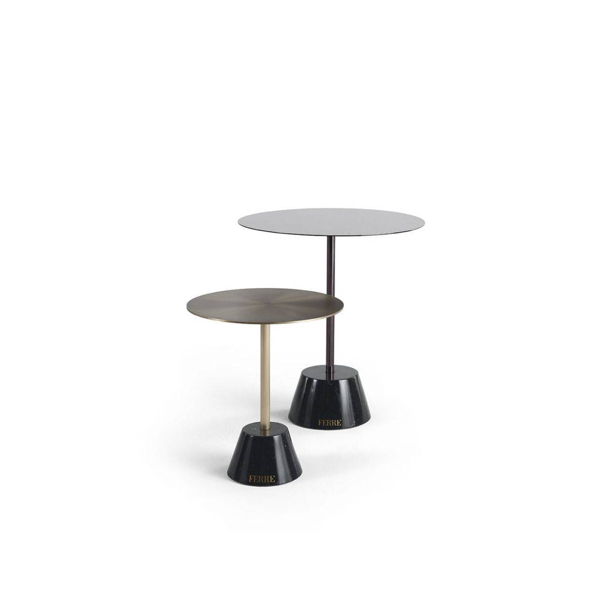 Кофейный или приставной столик с металлическим каркасом и столешницей с отделкой из черного хрома или бронзы. Основание – из мрамора Black Marquina.