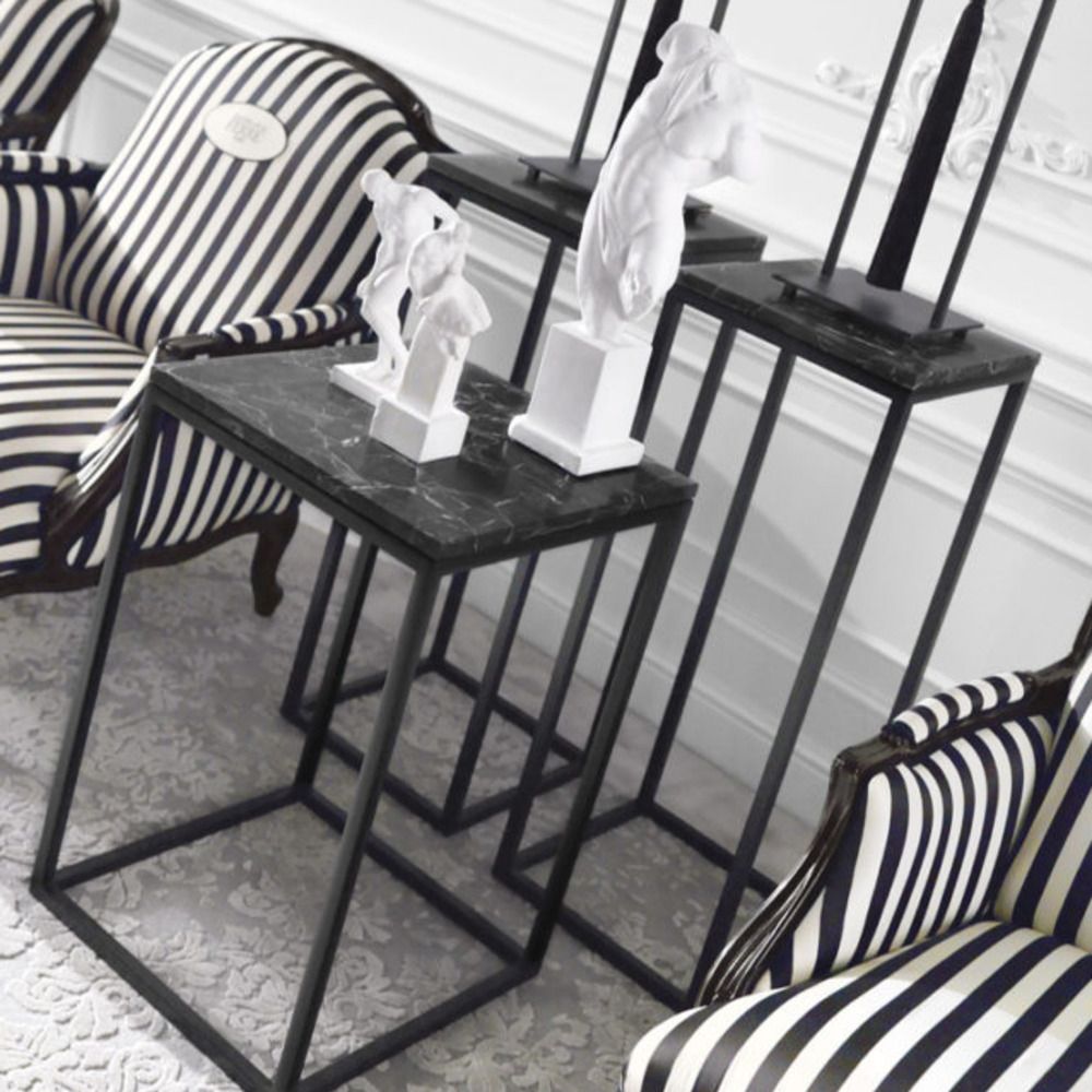 Структура из матовой черной стали. Столешница – из мрамора Damasco. Высота – 70 см.